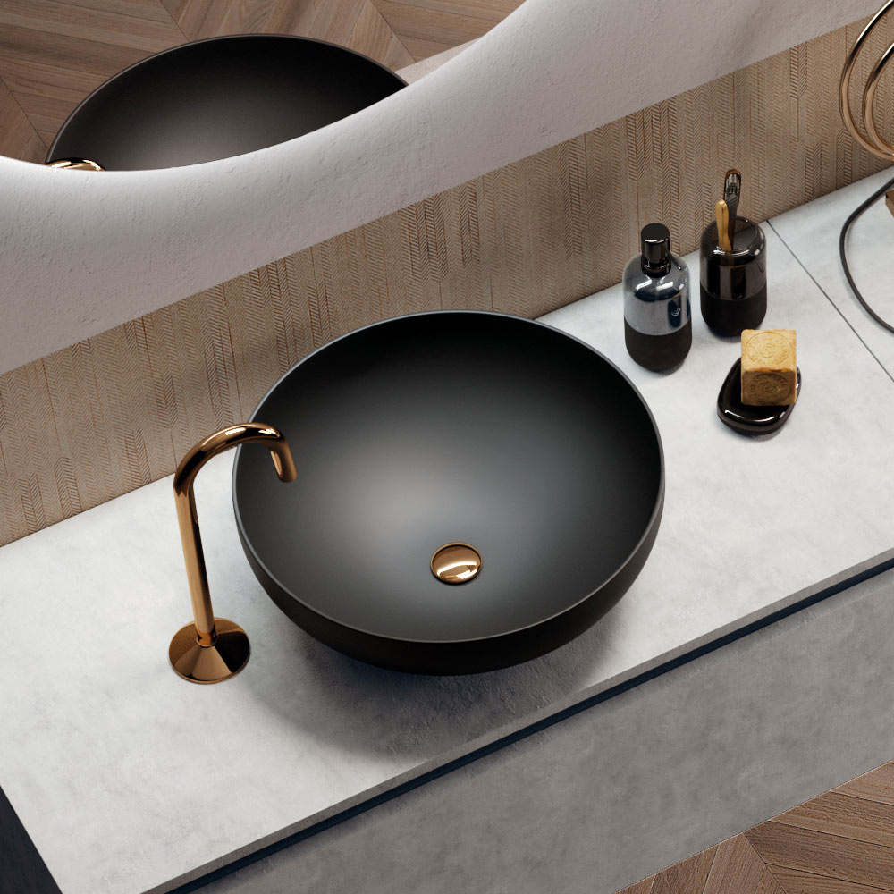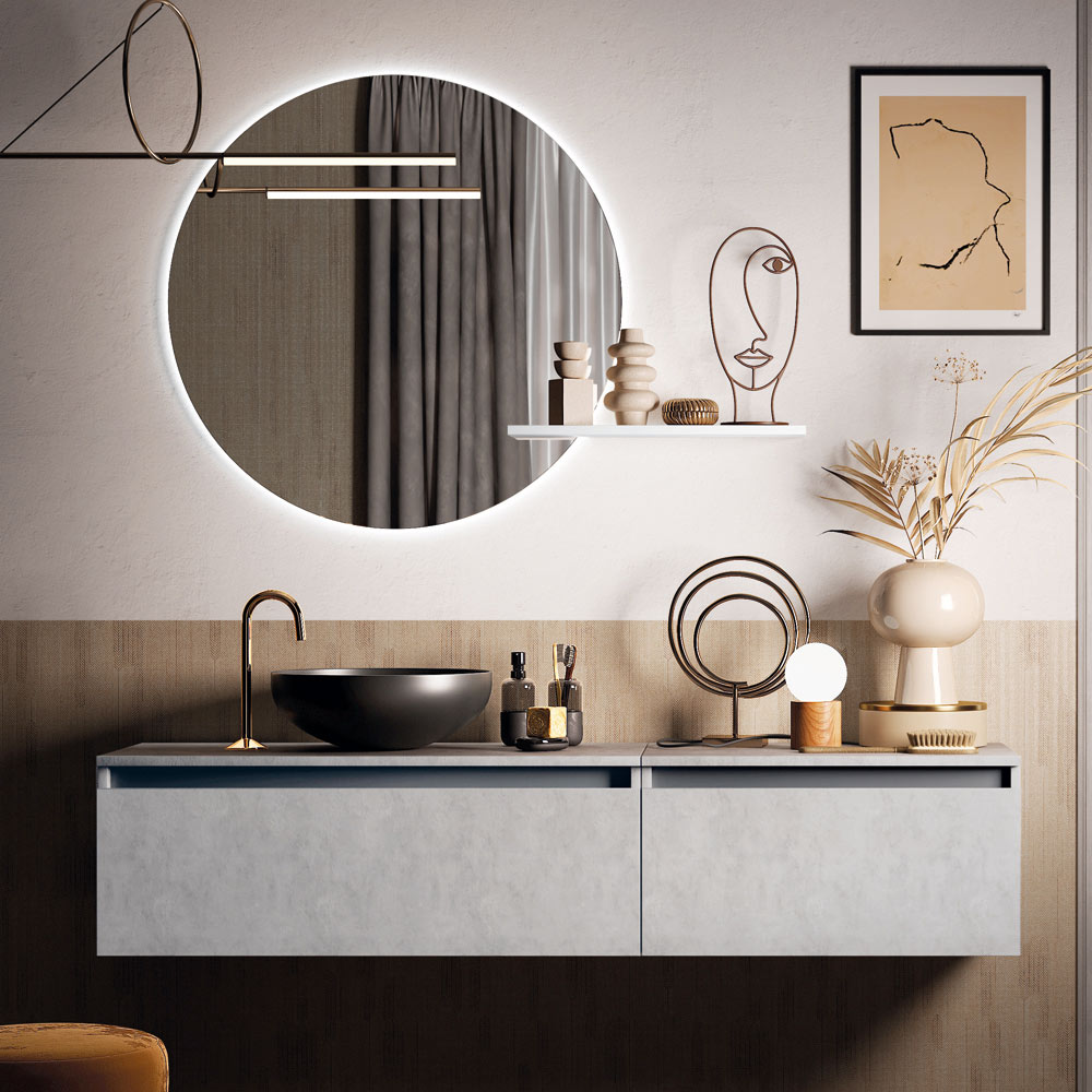 Compozitie baie cu lavoar din rasina lucioasa cu marginea de culoare antracit lucios, oglinda cu cadru ABS cu LED perimetral, baza suspendata din melaminat de ciment rezistent la zgarieturi cu 2 sertare complet extractibile si inchidere soft.