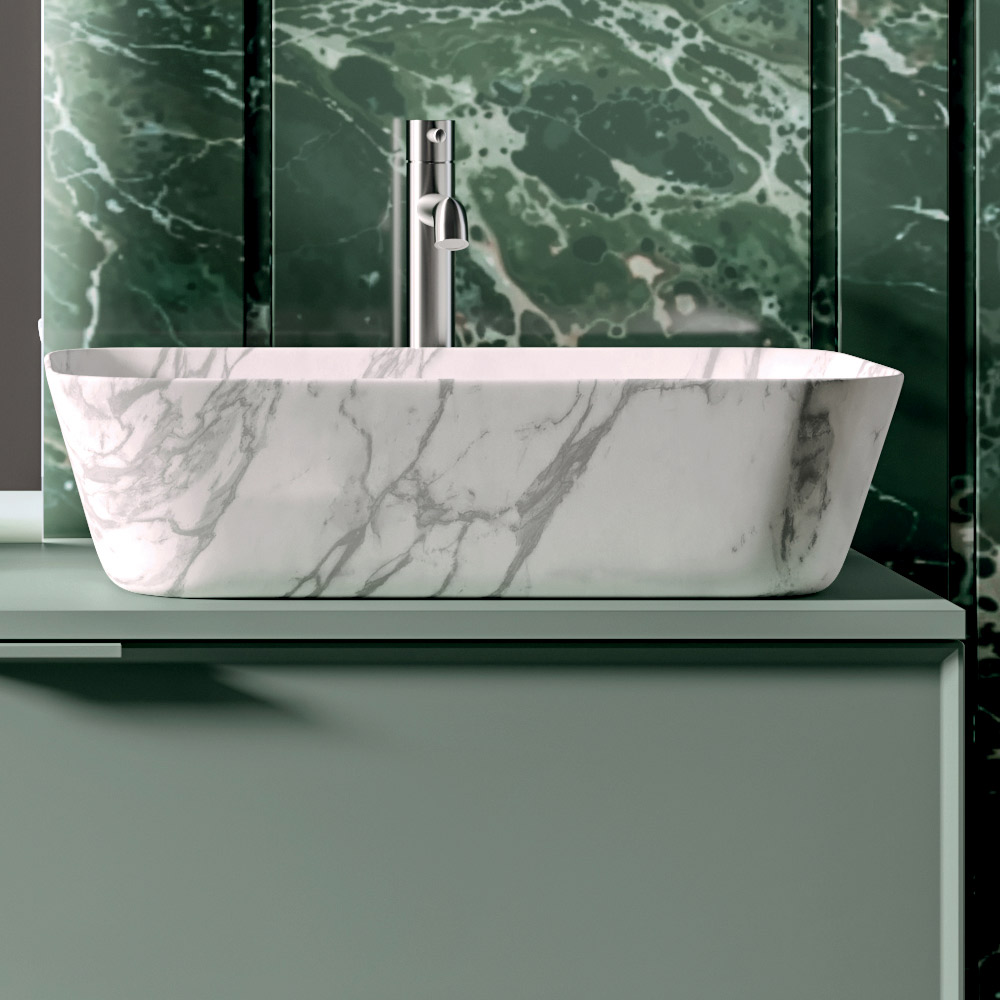 Lavoarul ceramic de blat cu efect Calacatta introduce un element material extrem de valoros, cu nervuri delicate care amintesc de marmura naturală și înfrumusețează întregul decor al băii.