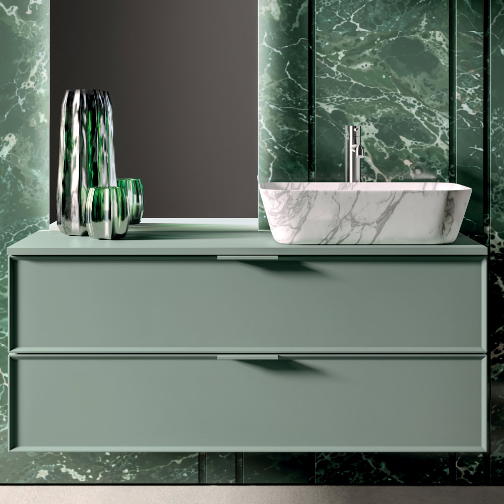 Compoziție de baie rafinată, cu un design modern , caracterizată prin linii curate și o paletă de culori naturale, relaxantă. Finisajul mat salvie conferă camerei un aspect contemporan și elegant, perfect pentru băile la modă .