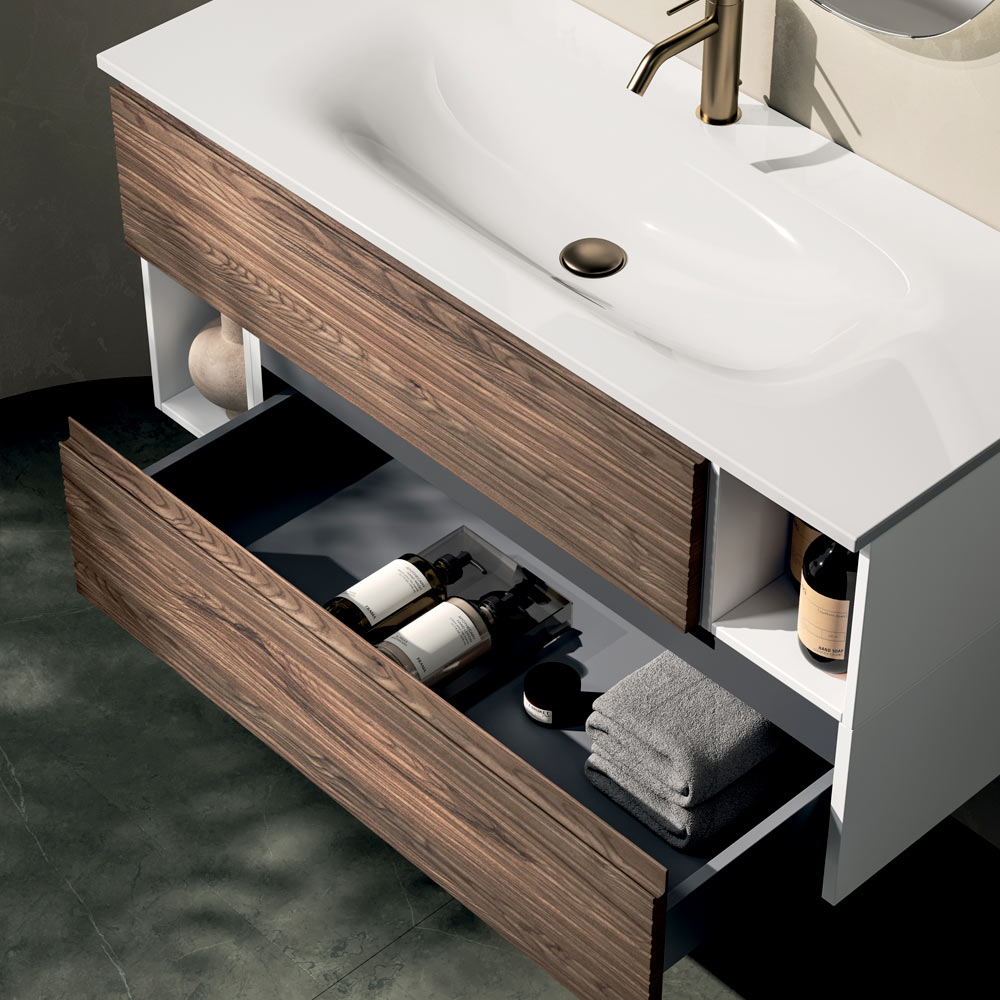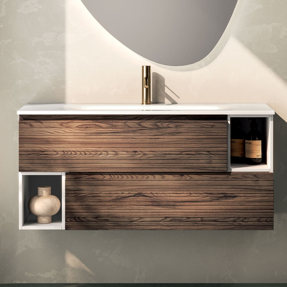 O compoziție elegantă suspendată pentru baie , care combină căldura lemnului cu linii curate și contemporane, concepută pentru spații rafinate, cu o personalitate puternică.