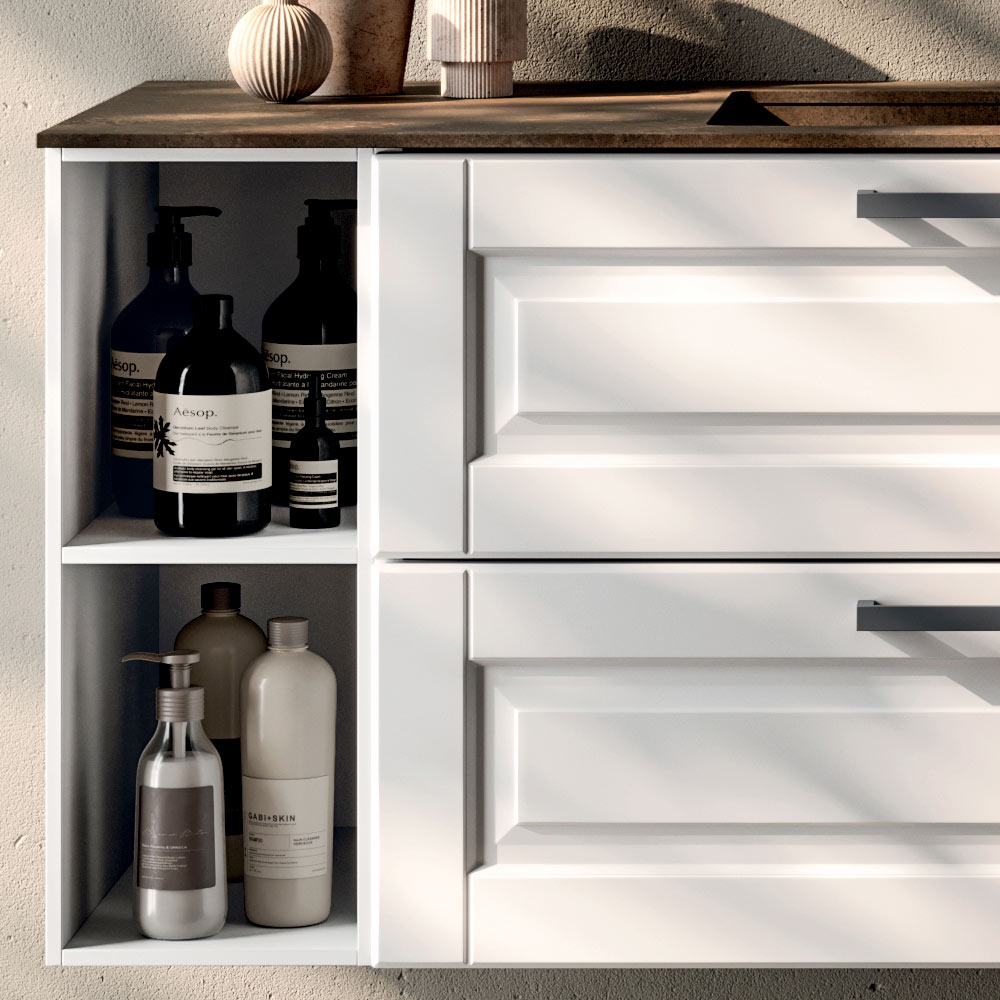 Unitatea de bază suspendată, cu sertar dublu și compartimente deschise, se remarcă prin liniile sale curate și designul esențial, conceput pentru a oferi echilibru vizual și funcționalitate de zi cu zi. Chiuveta integrată din gresie îmbunătățește suprafața cu un efect profund, texturat, inspirat de nuanțele naturale ale metalelor oxidate.