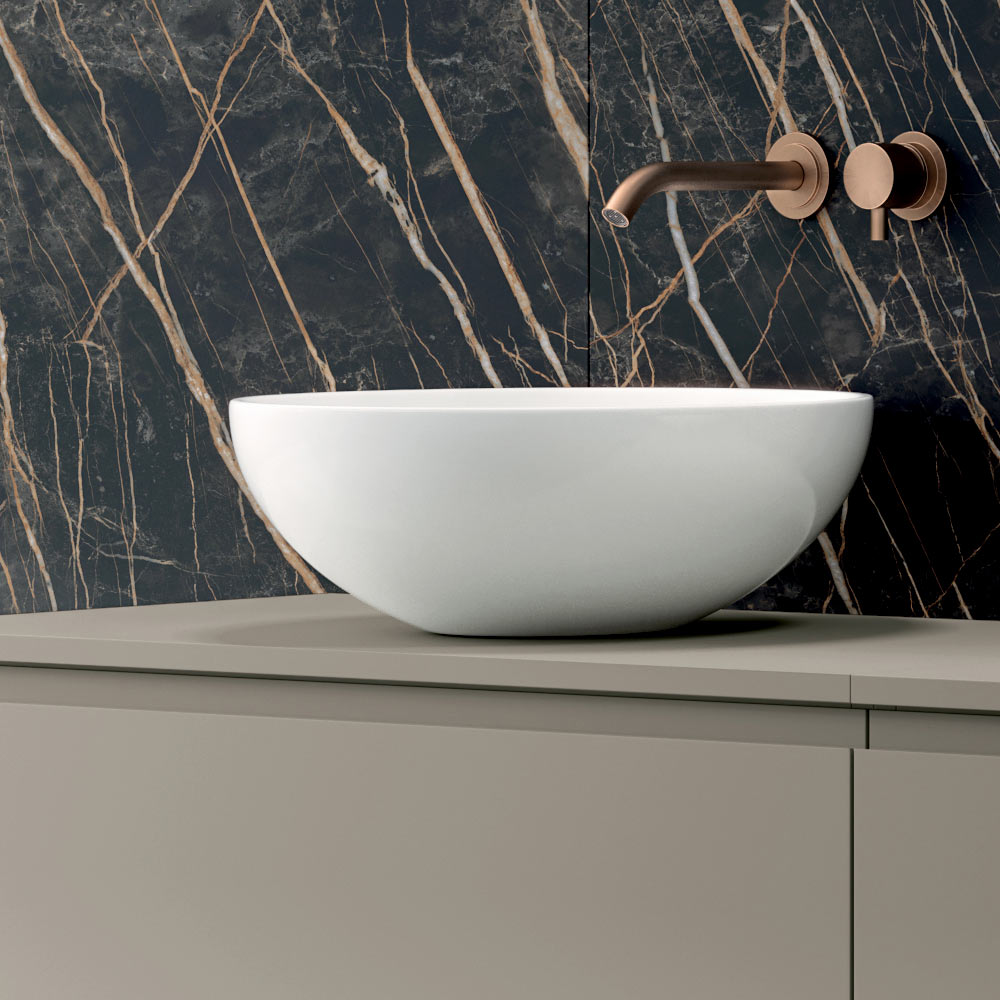 Cele două chiuvete de blat din ceramică albă lucioasă , cu formele lor simple și armonioase, asigură confortul zilnic și o curățare ușoară, oferind în același timp o estetică puternică. Configurația cu chiuvetă dublă face ca compoziția să fie ideală pentru băile matrimoniale sau spațiile comune.