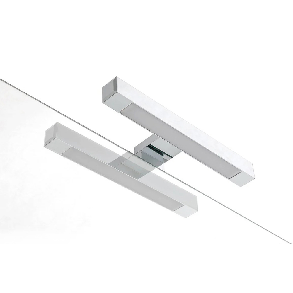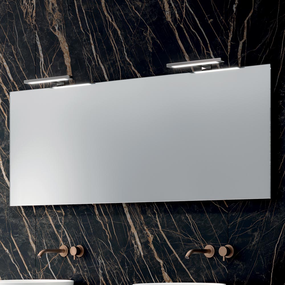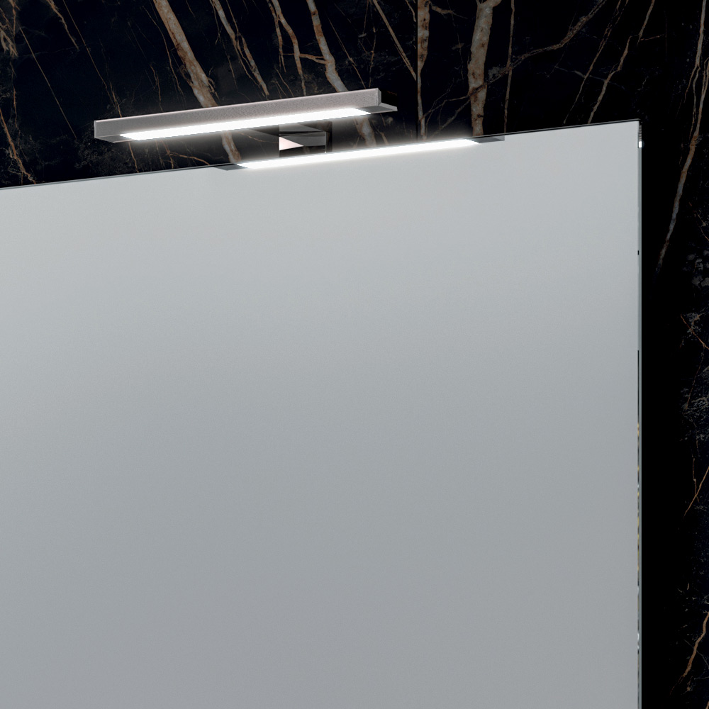 Oglinda dreptunghiulară amplifică luminozitatea și oferă profunzime spațiului, în timp ce lămpile LED cu finisaj cromat adaugă o iluminare elegantă și funcțională, perfectă pentru a pune în valoare zona chiuvetei.