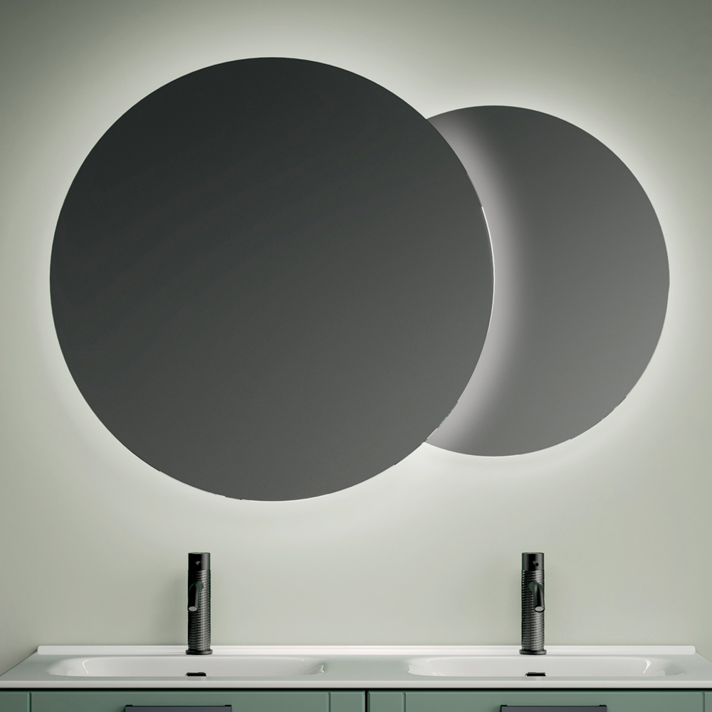Oglinzile rotunde iluminate din spate completează compoziția cu un efect de iluminare sugestiv, amplificând percepția spațiului și creând o atmosferă învăluitoare și contemporană.