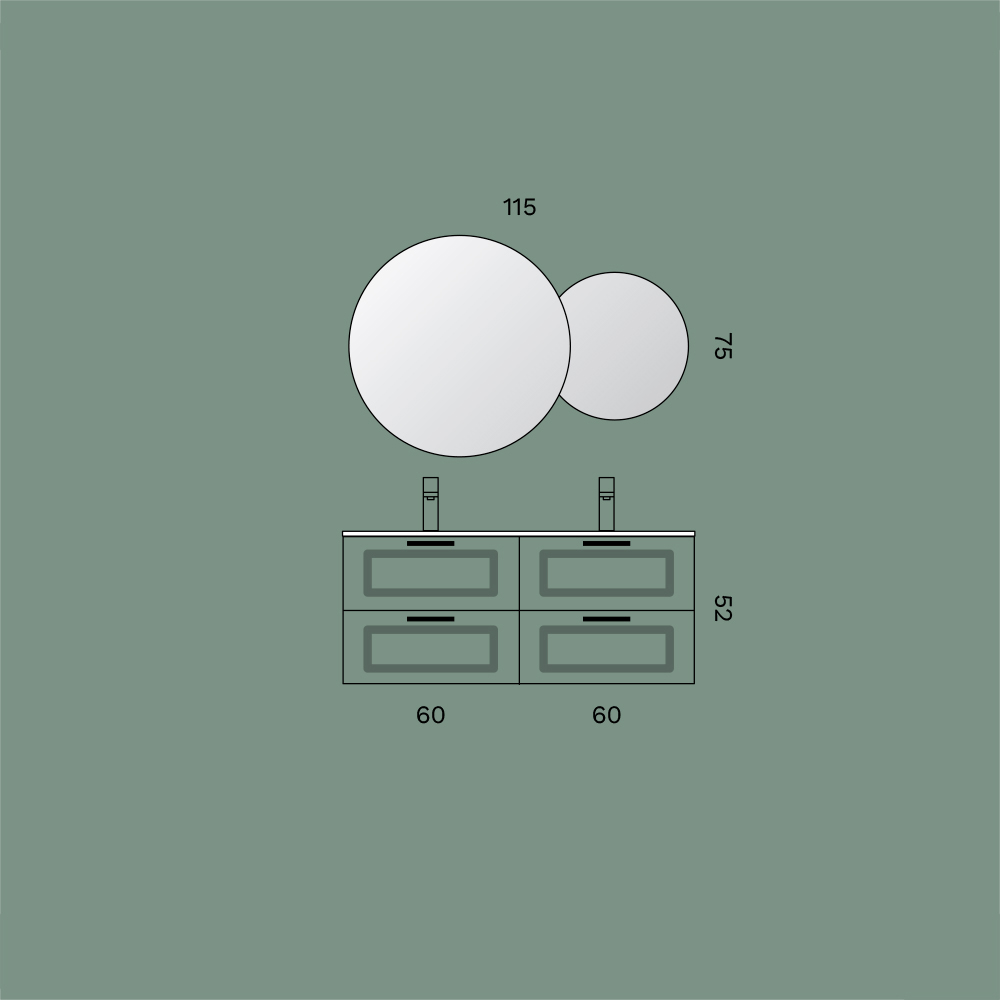 Cele două corpuri de mobilier de bază montate pe perete, cu sertare duble, creează o prezență echilibrată și funcțională, îmbunătățind spațiul cu linii curate și proporții moderne. Configurația chiuvetei duble din ceramică albă este concepută pentru a oferi confort maxim pentru utilizarea zilnică, menținând în același timp o estetică curată și ordonată.