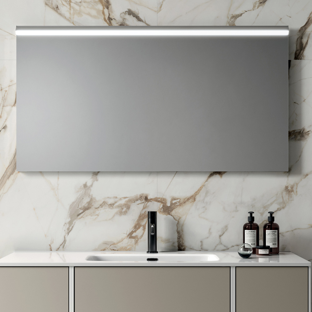Chiuveta din ceramică albă lucioasă adaugă luminozitate și contrast, asigurând în același timp durabilitate și ușurință în întreținere. Completând compoziția, oglinda LED cu iluminare integrată pune în valoare spațiul și creează o atmosferă elegantă și contemporană.
