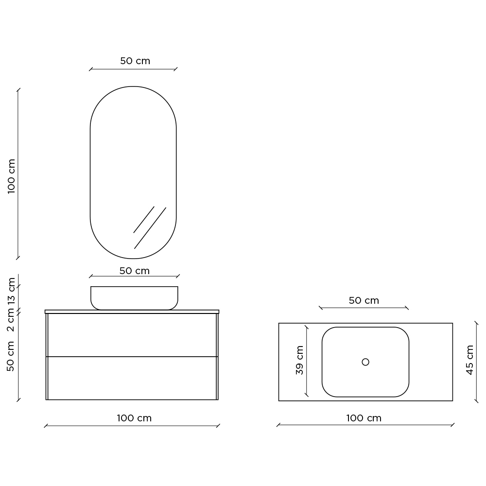 Compozitie baie cu baza din melaminat rezistent la zgarieturi, cu 2 sertare complet extractibile si inchidere moale in culoarea piatra Havana , oglinda ovala si chiuveta consola din ceramica alba lucioasa .