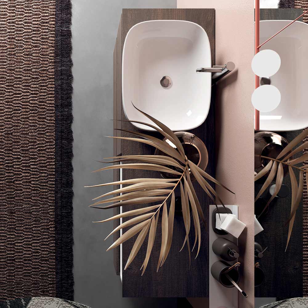 Compozitie de baie cu chiuveta ceramica , oglinda si baza antizgarieturi de culoare maro inchis , in intregime fabricata in Italia.