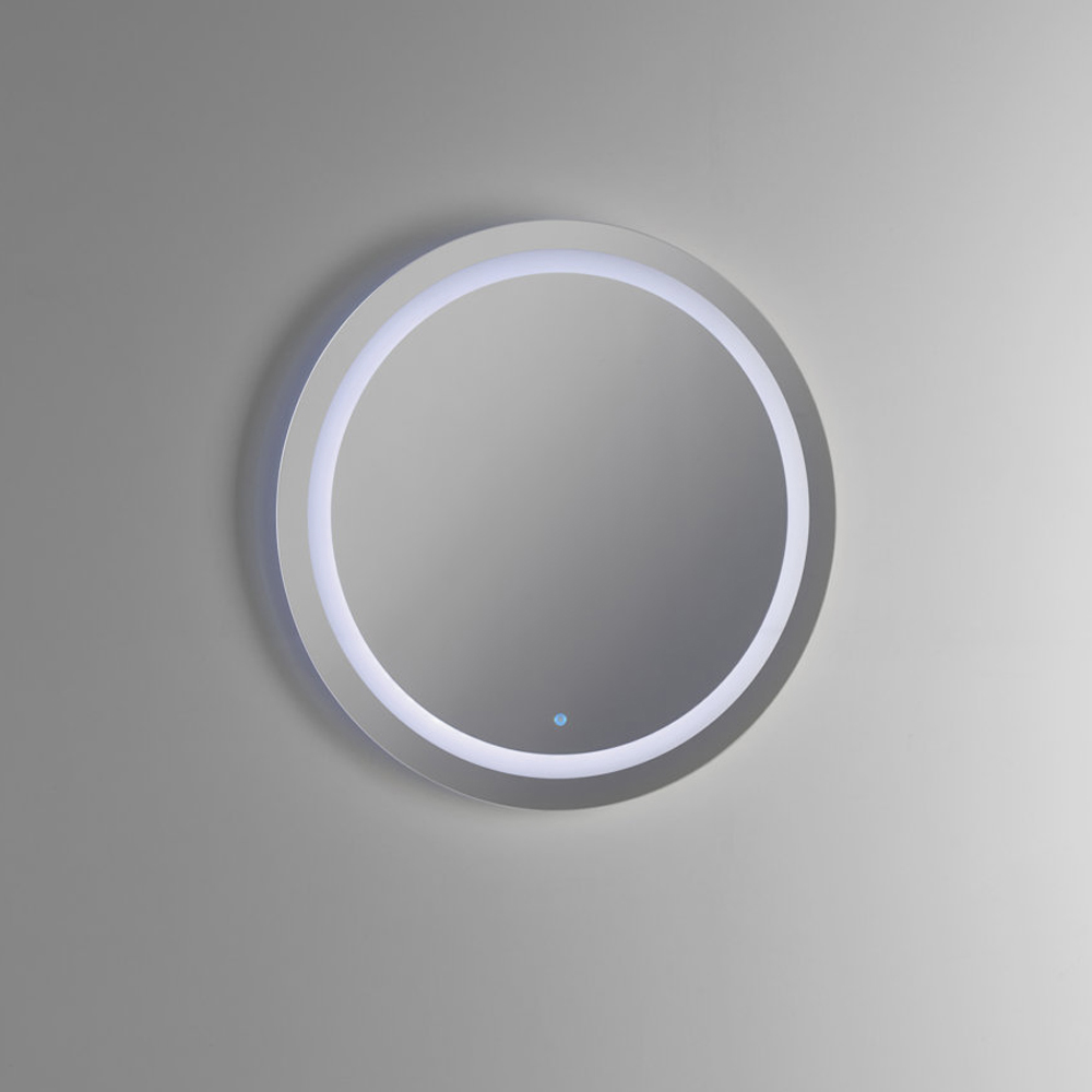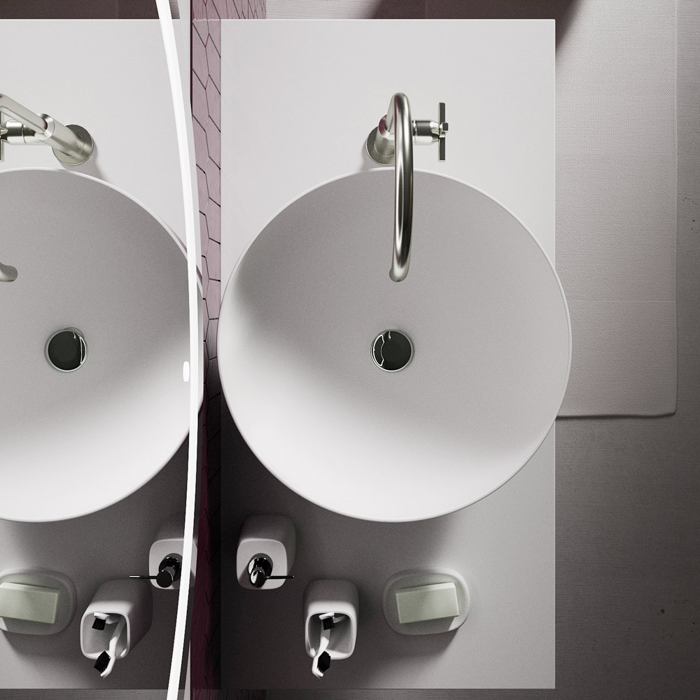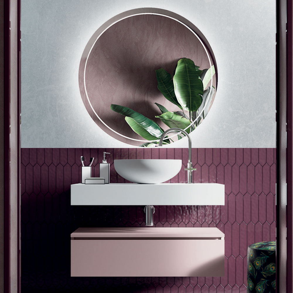 Compoziție de baie realizată în întregime în Italia constând dintr-o bază cu sertar din rășină roz deschis, blat din MDF stratificat și HPL alb , o chiuvetă din rășină albă lucioasă și oglindă rotundă din sticlă cu LED tactil .