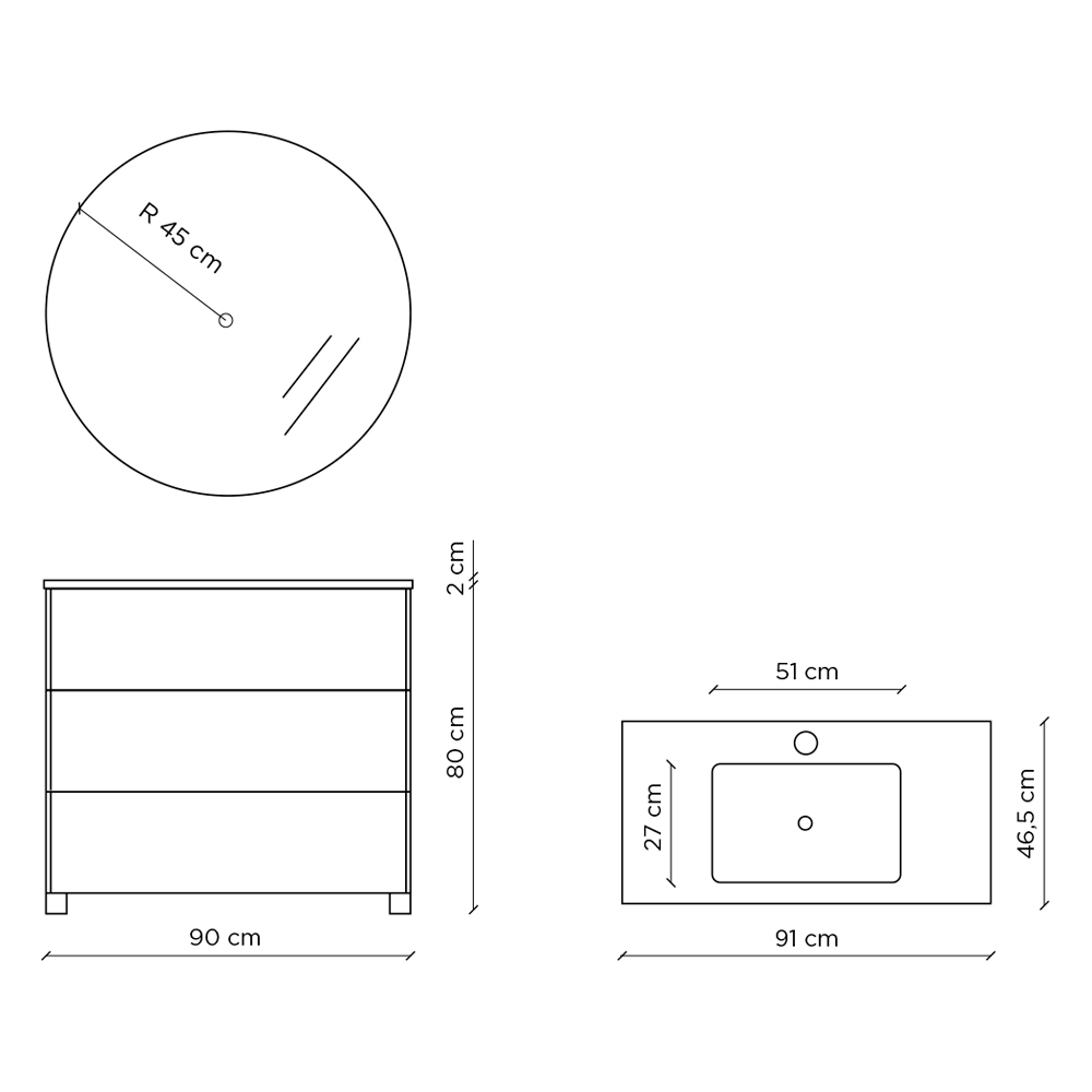 dimensiuni: Lavoar: L 51cm x D 27cm Baza: L 90cm x D 46.5cm x H 82cm Oglinda: R 45cm