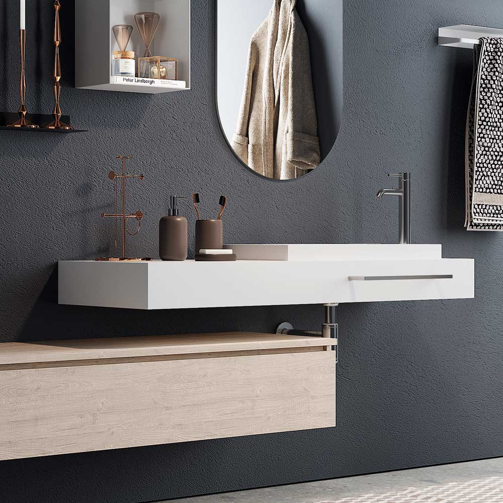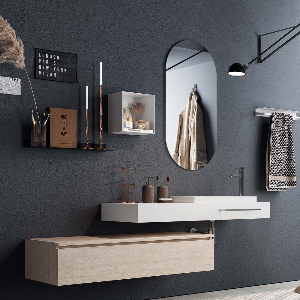 Compoziție de baie realizată în Italia compusă dintr- o oglindă ovală din sticlă , bază din melamină naturală, rezistentă la zgârieturi, de culoarea stejarului, cu sertar metalic complet extractibil și închidere moale . blat din mdf stratificat si hpl alb lucios pe care se sprijina o lavoar din rasina alba.