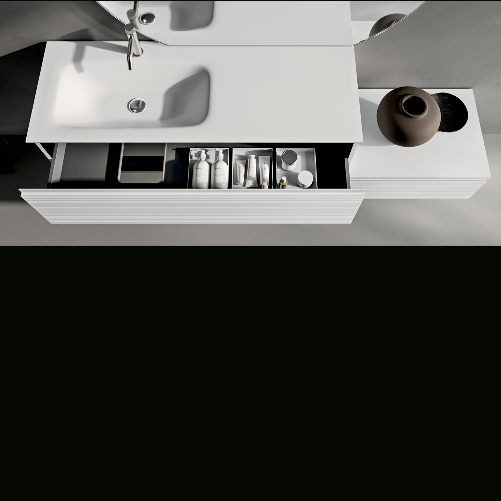 Mobilierul suspendat de baie, alb mat, prezintă linii curate și proporții echilibrate, oferind o soluție de depozitare funcțională și discretă. Finisajul mat sporește puritatea culorii, făcând compoziția ideală atât pentru spațiile rezidențiale, cât și pentru proiecte contractuale de înaltă calitate.