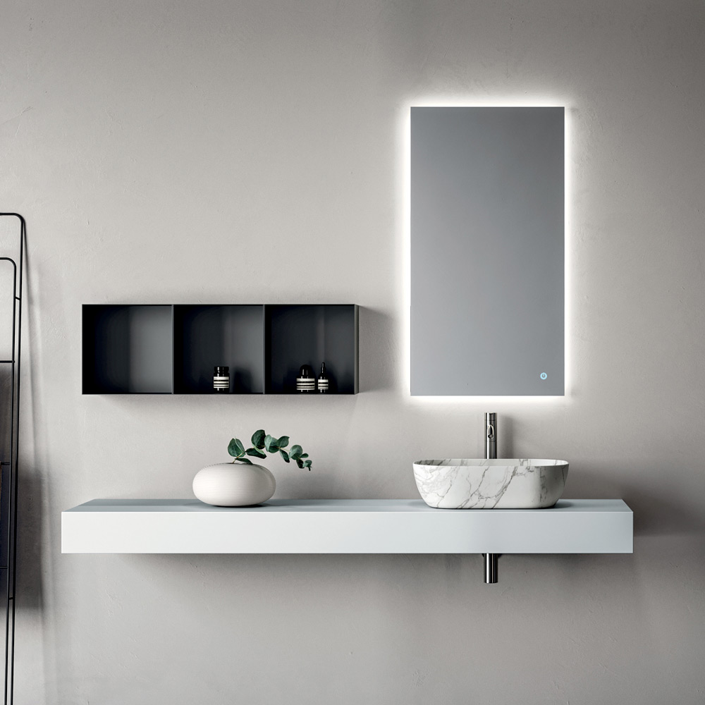 Oglinda cu iluminare din spate completează ansamblul, oferind o iluminare funcțională și scenică, perfectă pentru a pune în valoare peretele și a mări vizual spațiul.
