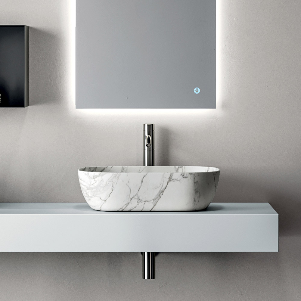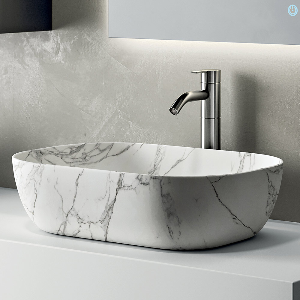 Chiuveta ceramică cu finisaj Calacatta adaugă o notă sofisticată: suprafața inspirată de marmură sporește strălucirea albului și conferă prestigiu zonei chiuvetei.