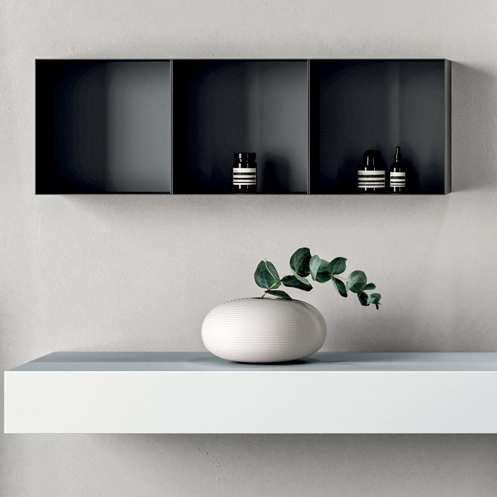 Cele 3 corpuri de mobilier suspendate din metal negru creează un contrast elegant de culori și adaugă spațiu de depozitare vertical, făcând compoziția dinamică și modernă.