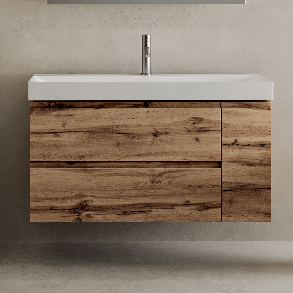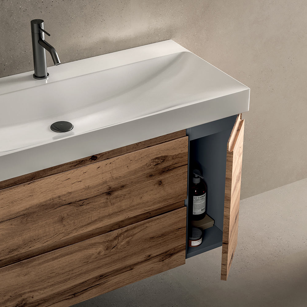 Unitatea de bază cu două sertare și o ușă laterală oferă spațiu de depozitare funcțional, asigurând practicitatea zilnică și o estetică curată. Liniile curate și designul suspendat luminează vizual baia.