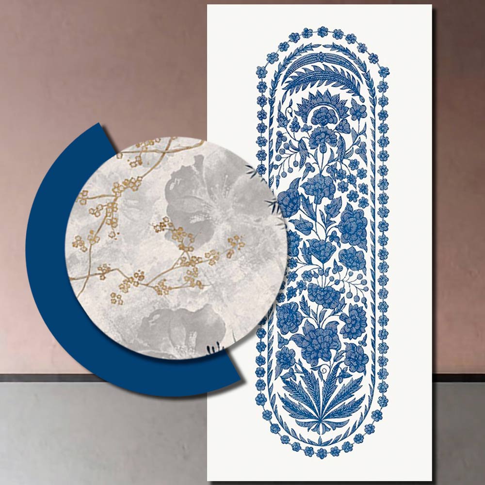 imprimeu de ramuri, frunze si flori si detaliu semiluna