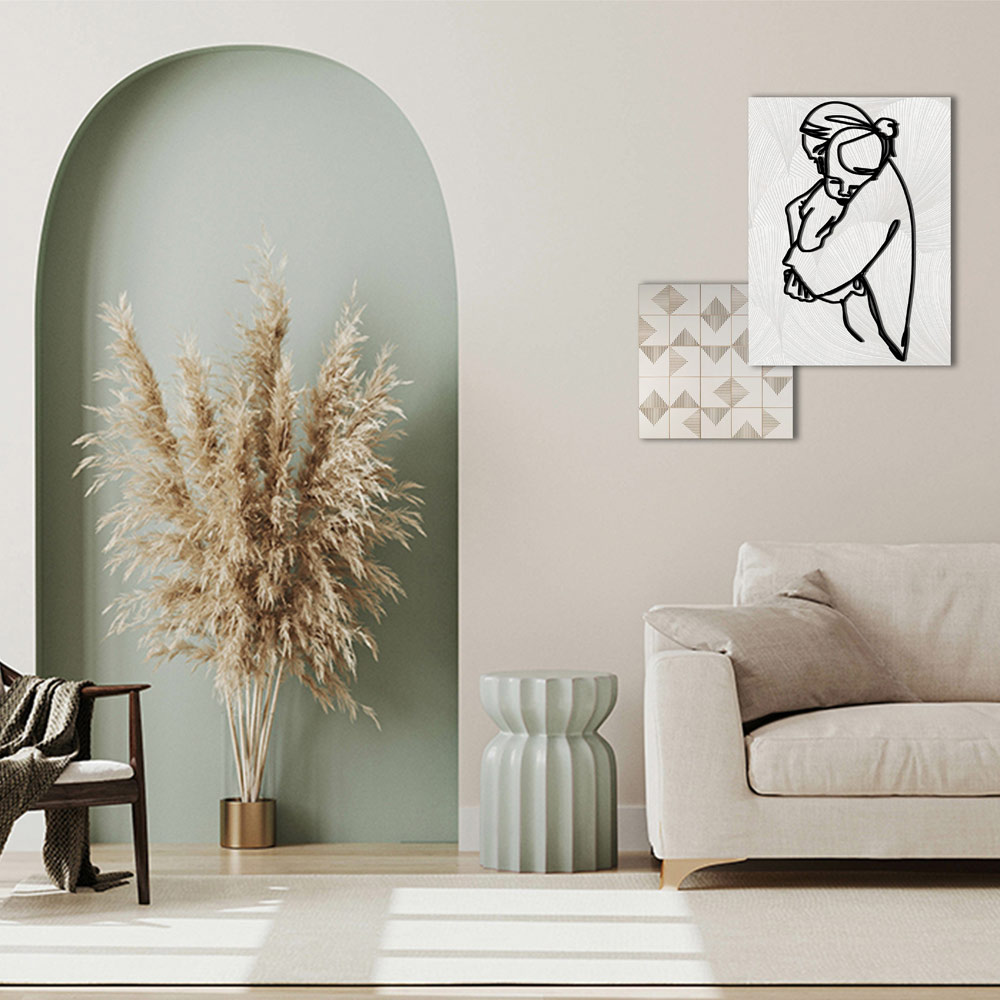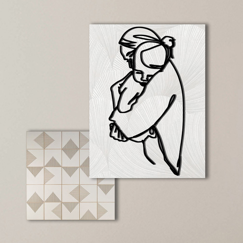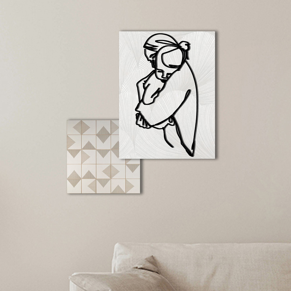 Compoziție din două panouri de forme și dimensiuni diferite care combină decorațiunile laser și imprimate. Cele doua tablouri pot fi pozitionate pe perete dupa dorinta, chiar si separat. Compus din 2 panouri din lemn imprimat : unul dreptunghiular infatisand o imbratisare intre mama si copil si celalalt patrat cu motive geometrice triunghiulare.