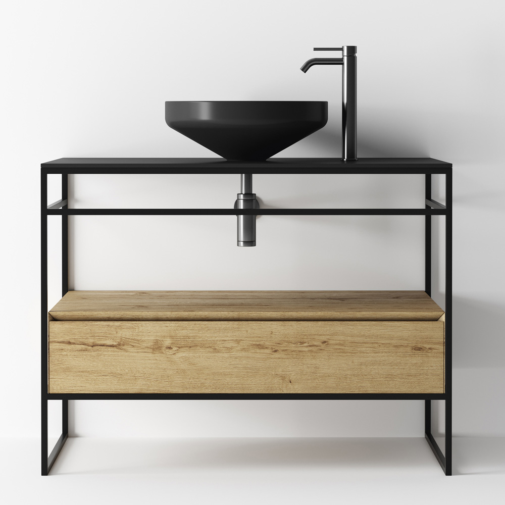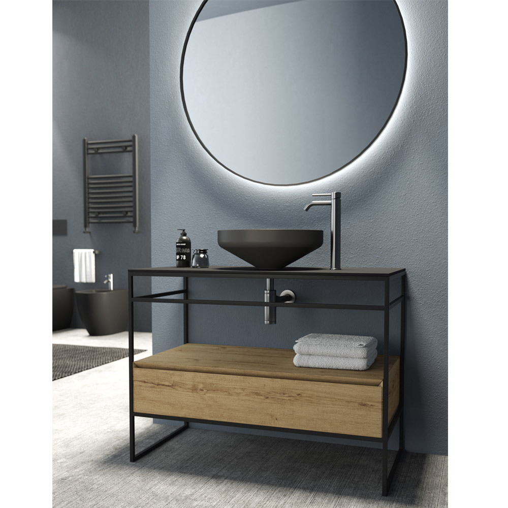 Compozitie mobilier baie complet realizata in Italia formata dintr-un lavoar din ceramica finisaj negru mat , baza cu structura din inox negru mat si blat din ceramica neagra mata cu sertar practic din lemn finisaj stejar cu taiere la 45° si inchidere lenta. Compoziția este completată de oglinda de perete rotundă iluminată din spate cu cadru din aluminiu cu finisaj negru mat.