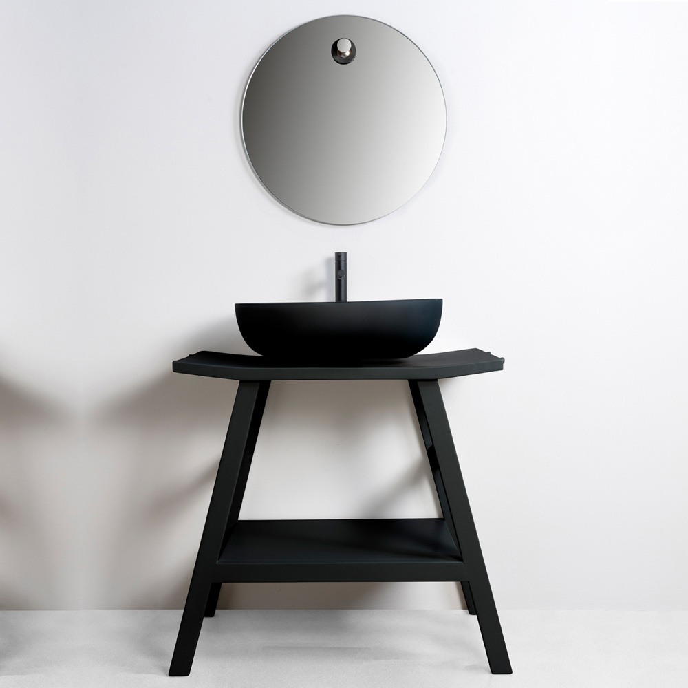 Compozitie mobilier de baie cu chiuveta din rasina neagra si oglinda rotunda.