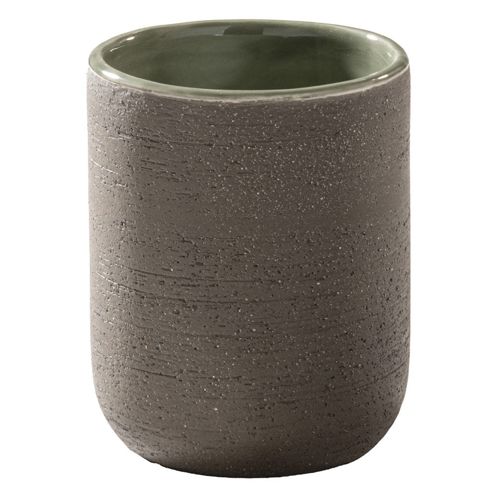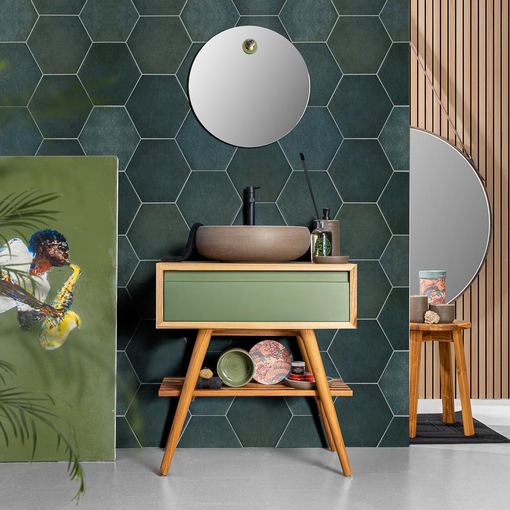 Compozitie baie cu chiuveta din lut, accesorii blat si oglinda.
