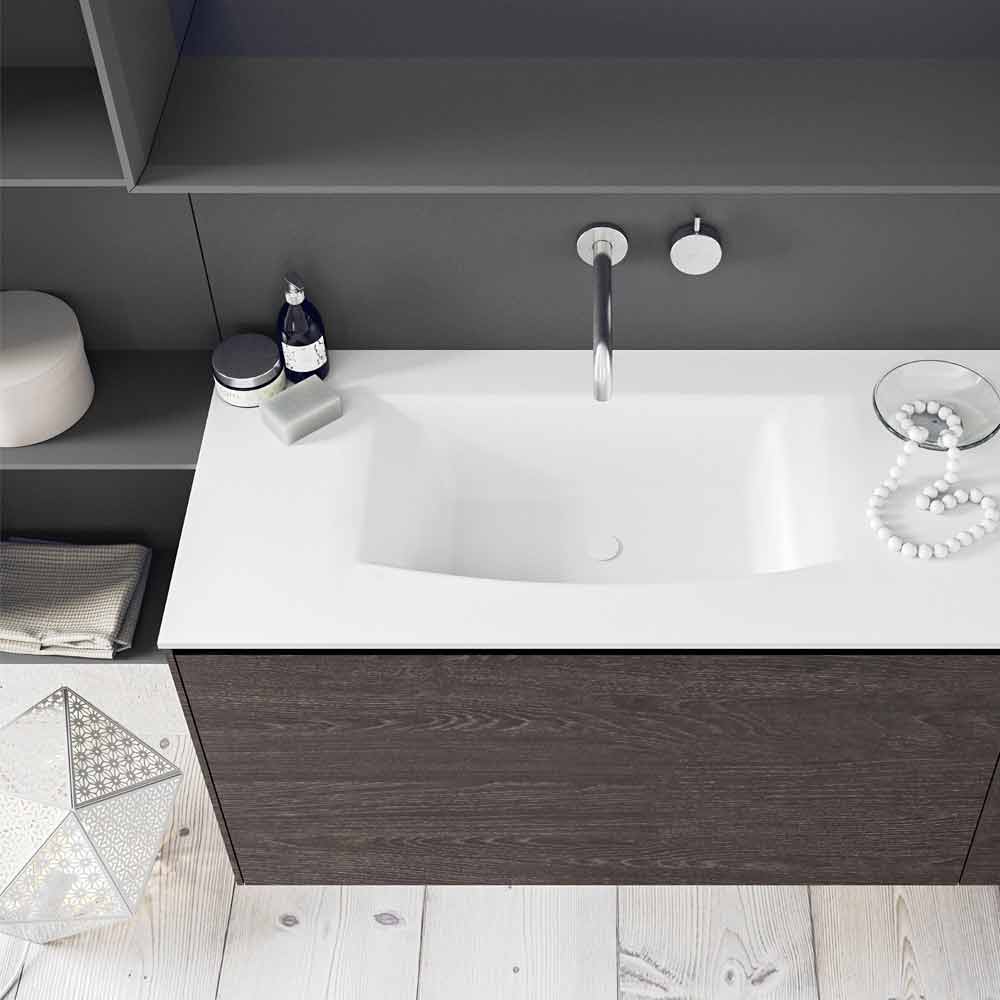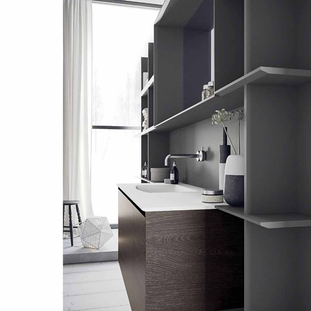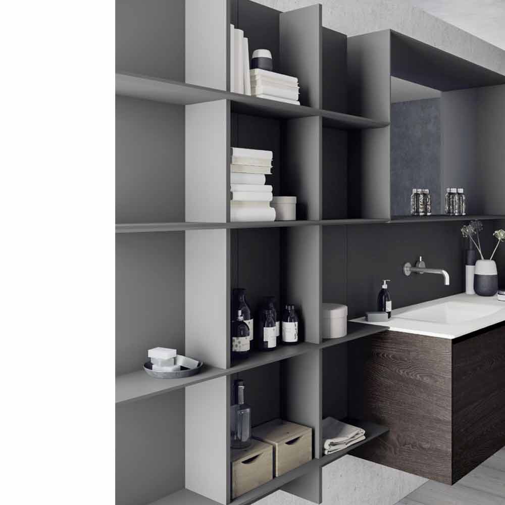 Compoziție modernă pentru baie, suspendată și design regulat cu rafturi deschise, fabricată în Italia.