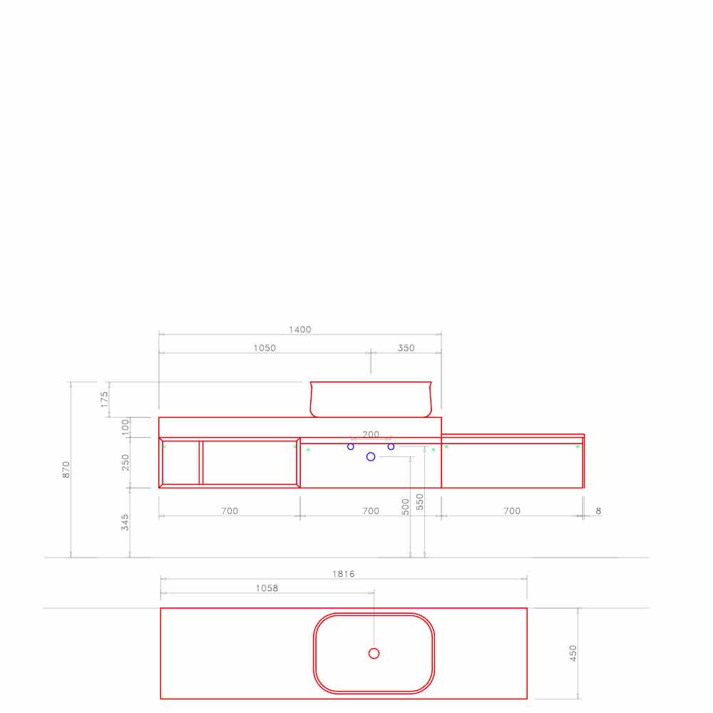 Particularitatea acestei compoziții este dată de silueta lavoarului de blat , care se distinge prin marginea care se deschide spre exterior amintind forma unei lalele, spre deosebire de liniaritatea compartimentelor subiacente, atenuând formele.