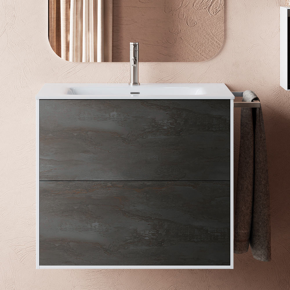 Compoziție de baie completă cu chiuvetă consolă din ceramică albă lucioasă, oglindă din sticlă cu lampă și bază din melamină rezistentă la zgârieturi de culoare oxidată cu 2 sertare complet extractibile cu închidere moale.