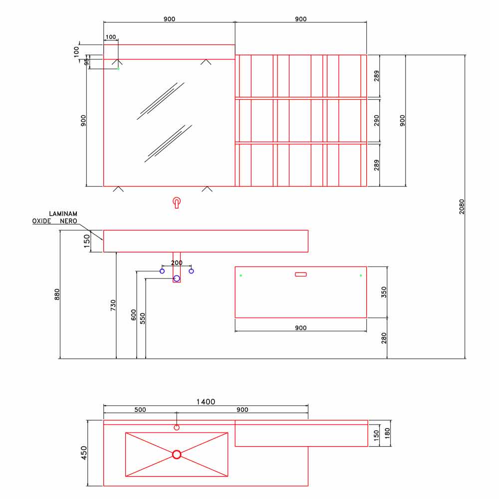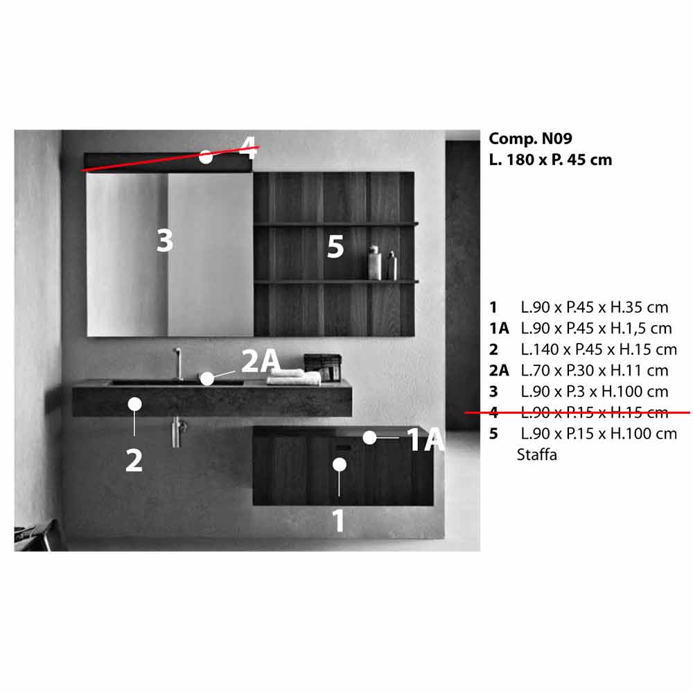 Compoziția este din chiuvetă de stejar tratată termic, suspendată în perete, în oxid de laminam negru.