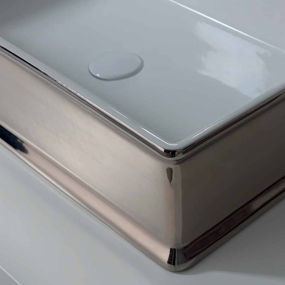 Debora este lavoarul de blat produs din ceramică albă și platinată care întruchipează rafinamentul și eleganța fără a neglija funcționalitatea.