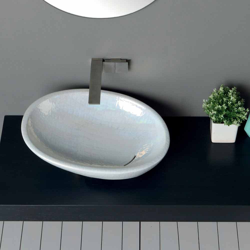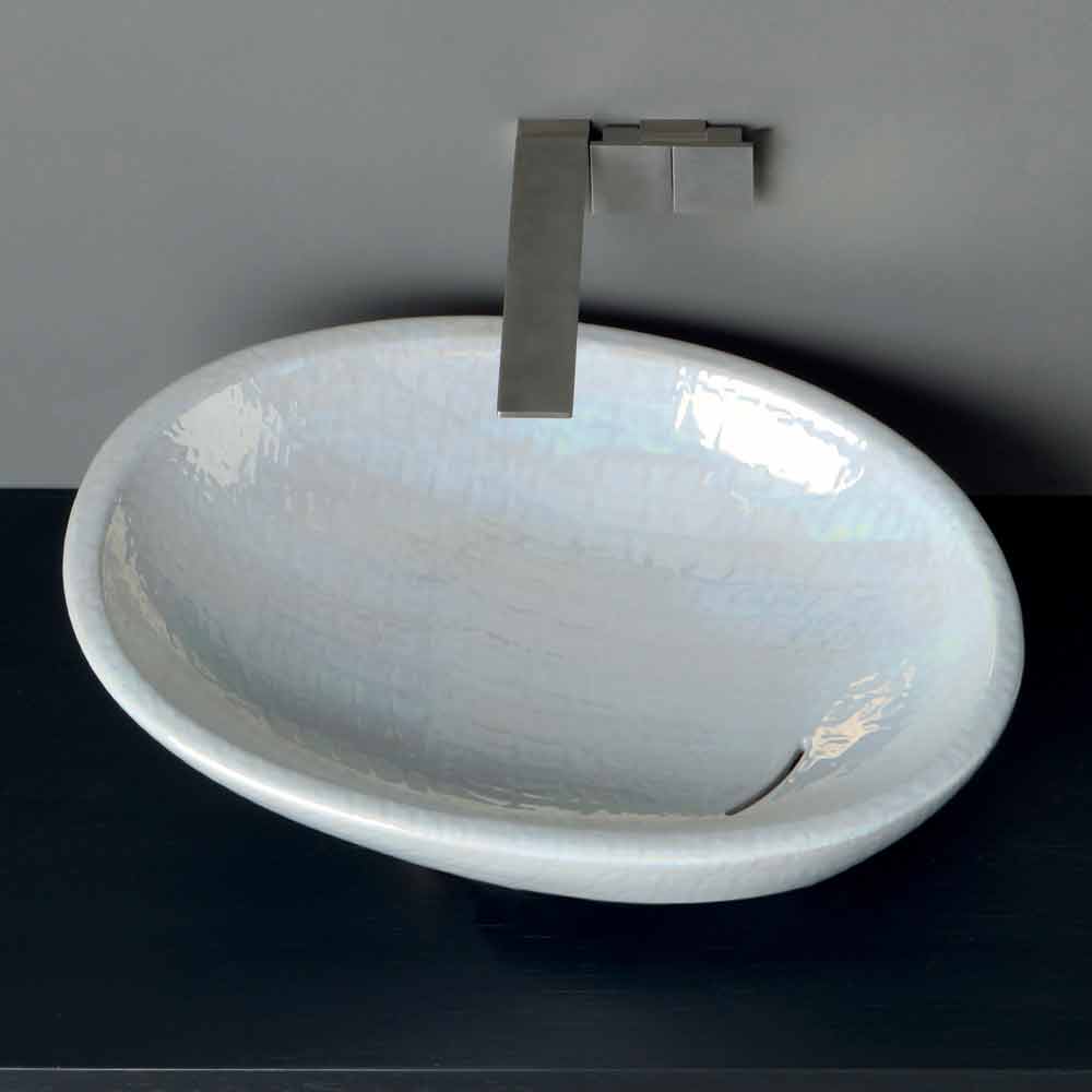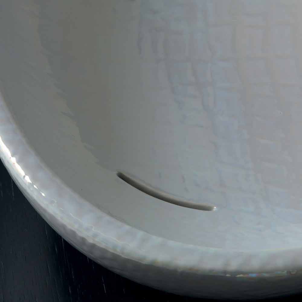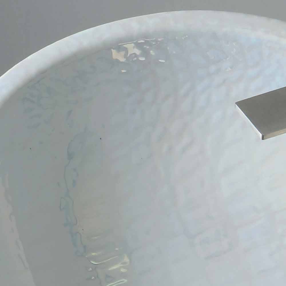 Lucrat manual în ceramică cu finisaj sidefat; înclinat cu o formă moale și alungită și cu scurgere continuă a fluxului de apă.