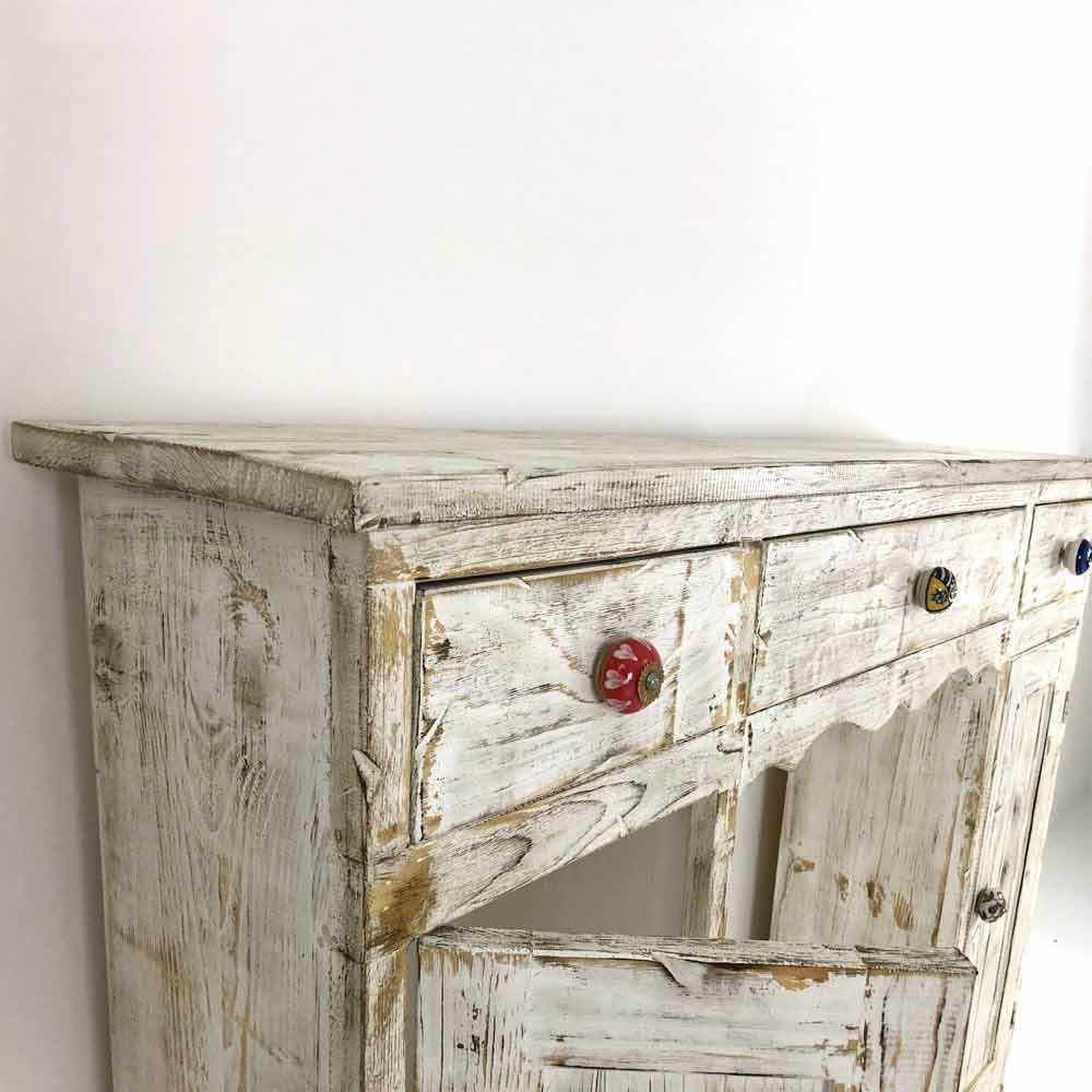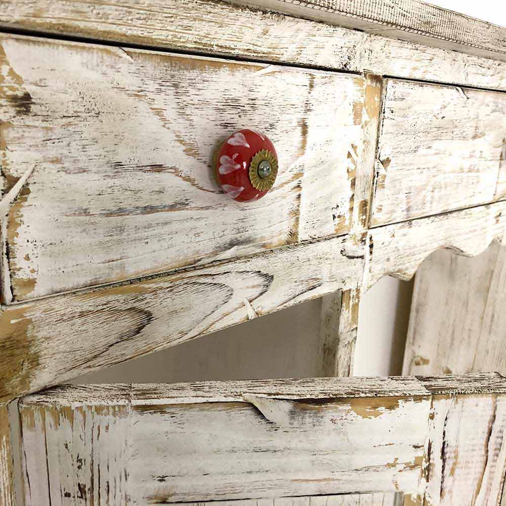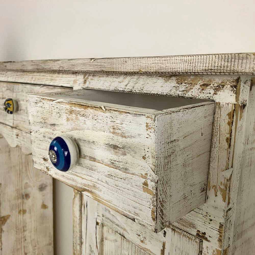 Consolă din lemn masiv de brad realizată manual integral în Italia și caracterizată de minunatul finisaj ars cu flăcări și văruit în alb. Structura sa include 2 uși cu raft intern și 3 sertare care sunt completate cu butoane speciale din ceramică pictate manual care vă permit să aveți spații perfect organizate.