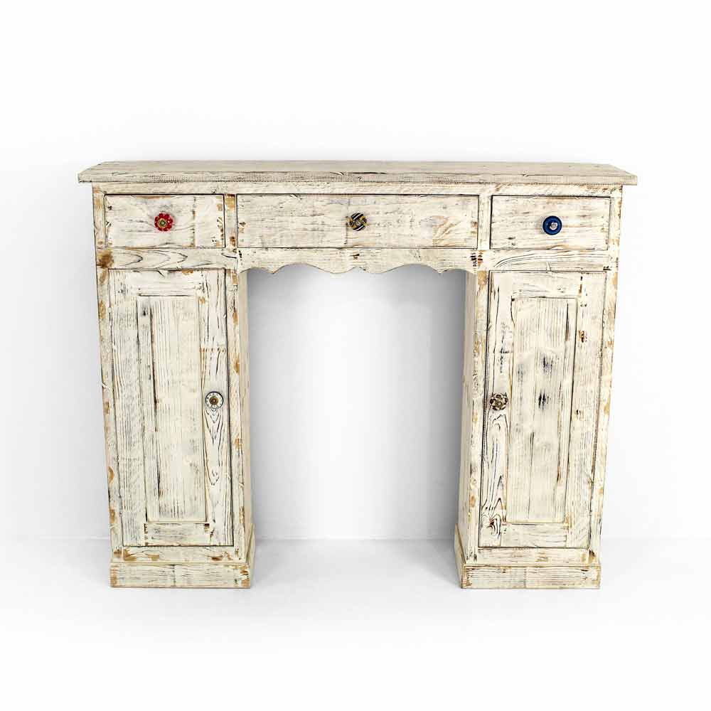 Consolă din lemn masiv de brad vopsit cu pământ alb îmbătrânit, obiect de lux Made in Italy.