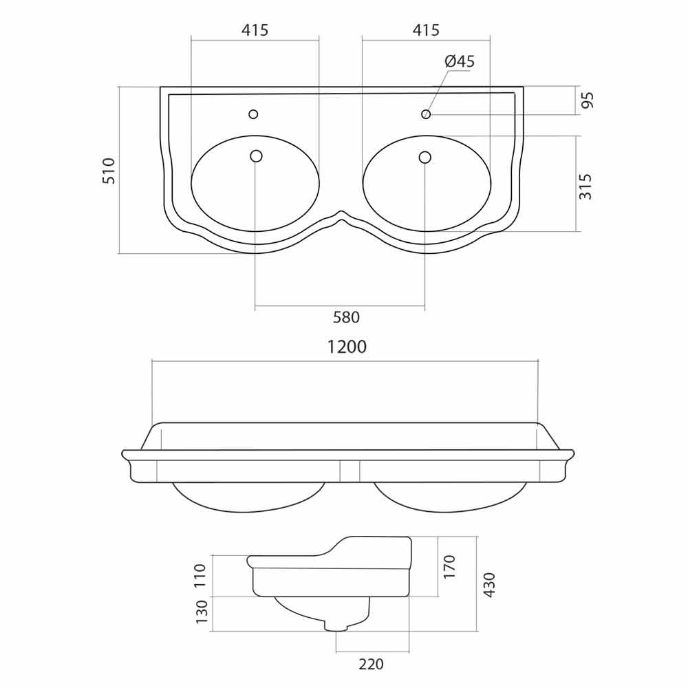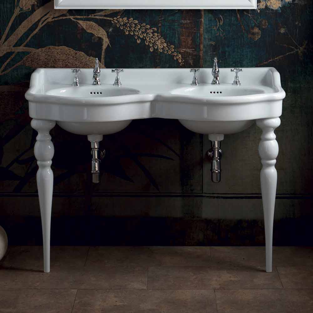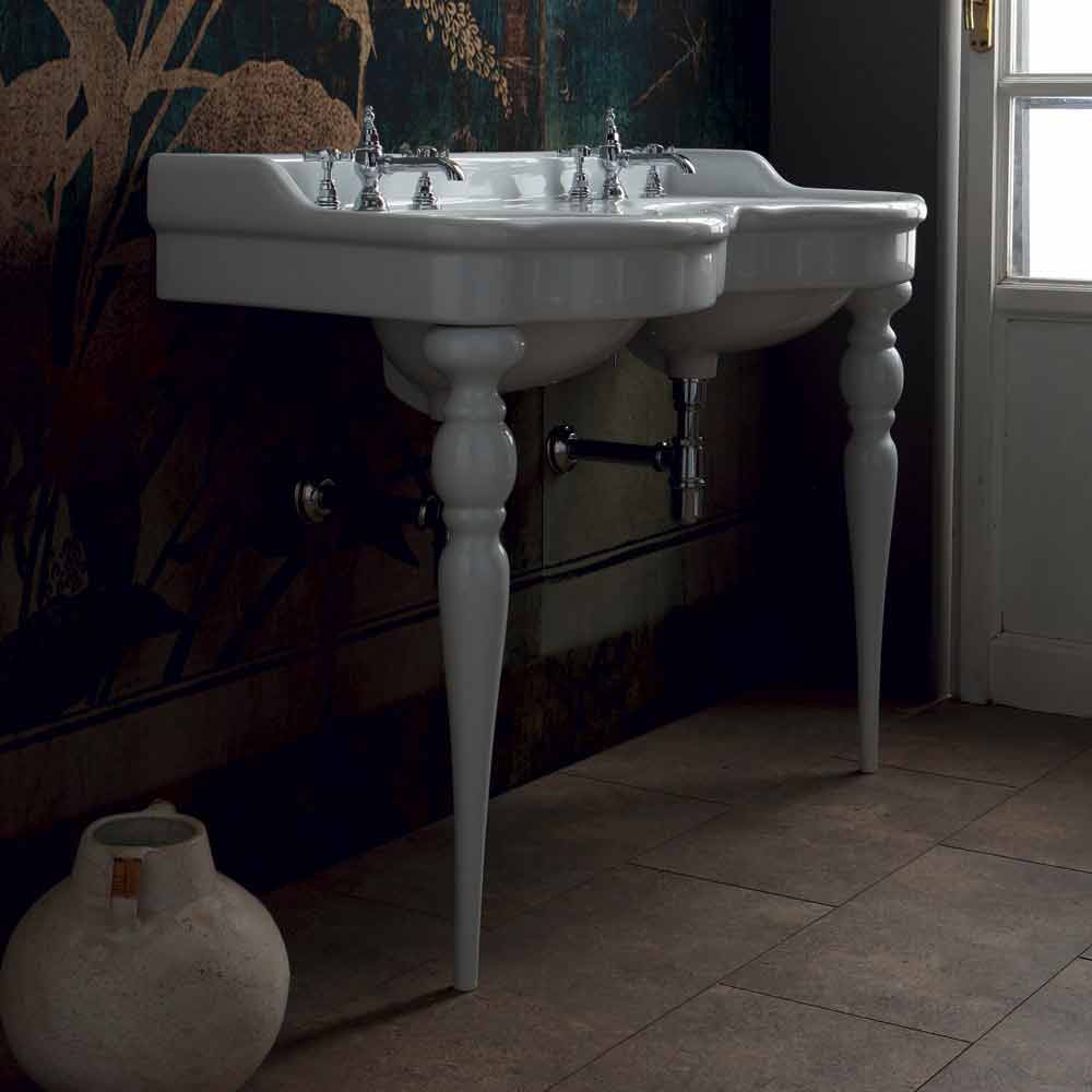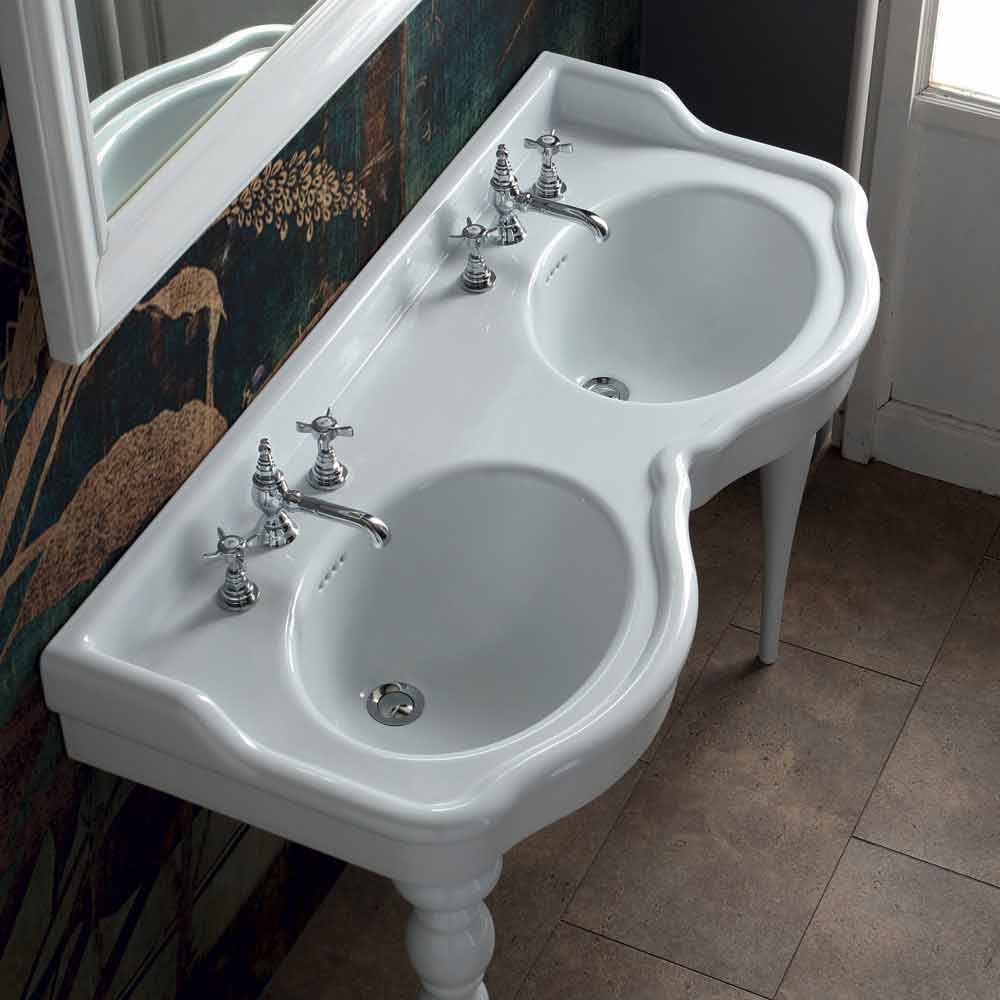 Consolă de baie dublă din ceramică albă clasică, Magda Chiuvetă cu consolă de blat cu chiuvetă dublă realizată în întregime din ceramică albă. Distins printr-un design clasic și o geometrie moale, este capabil să recreeze o atmosferă senină în baia ta.
