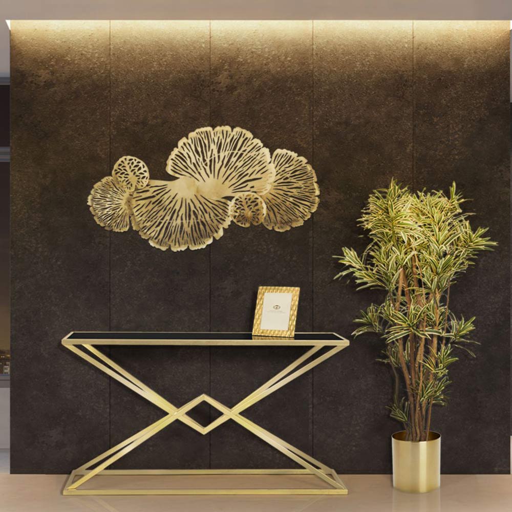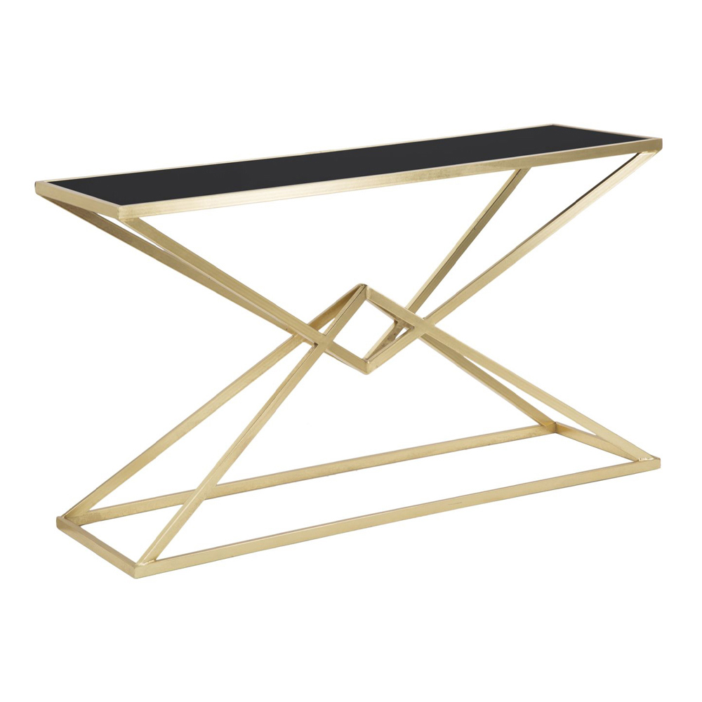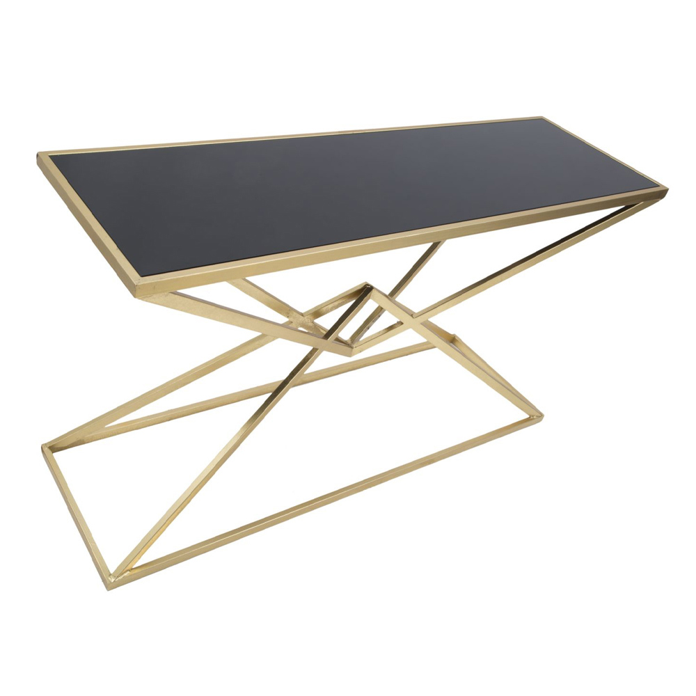 Consolă fixă modernă din fier cu finisaj auriu cu blat din sticlă neagră.