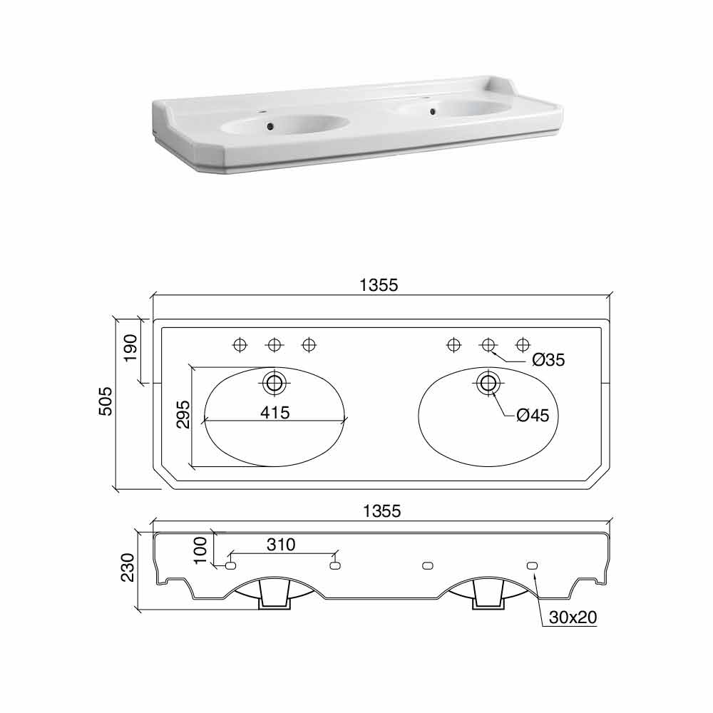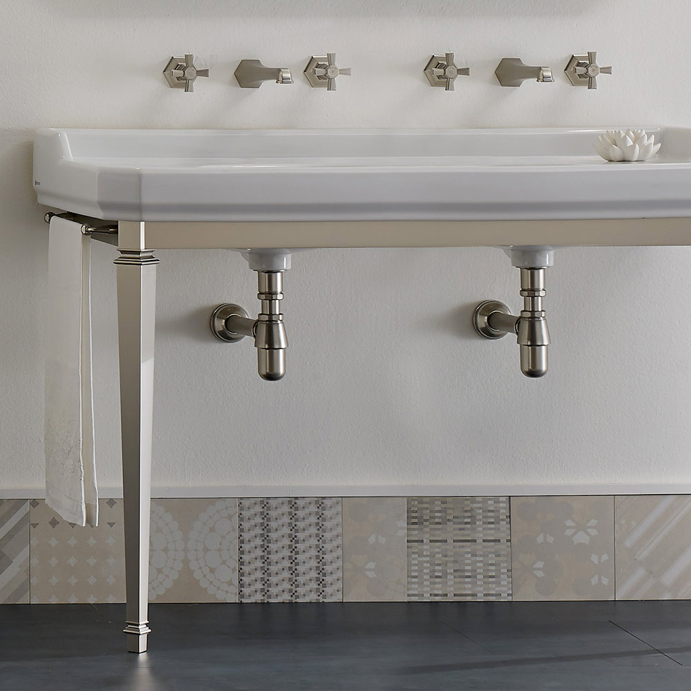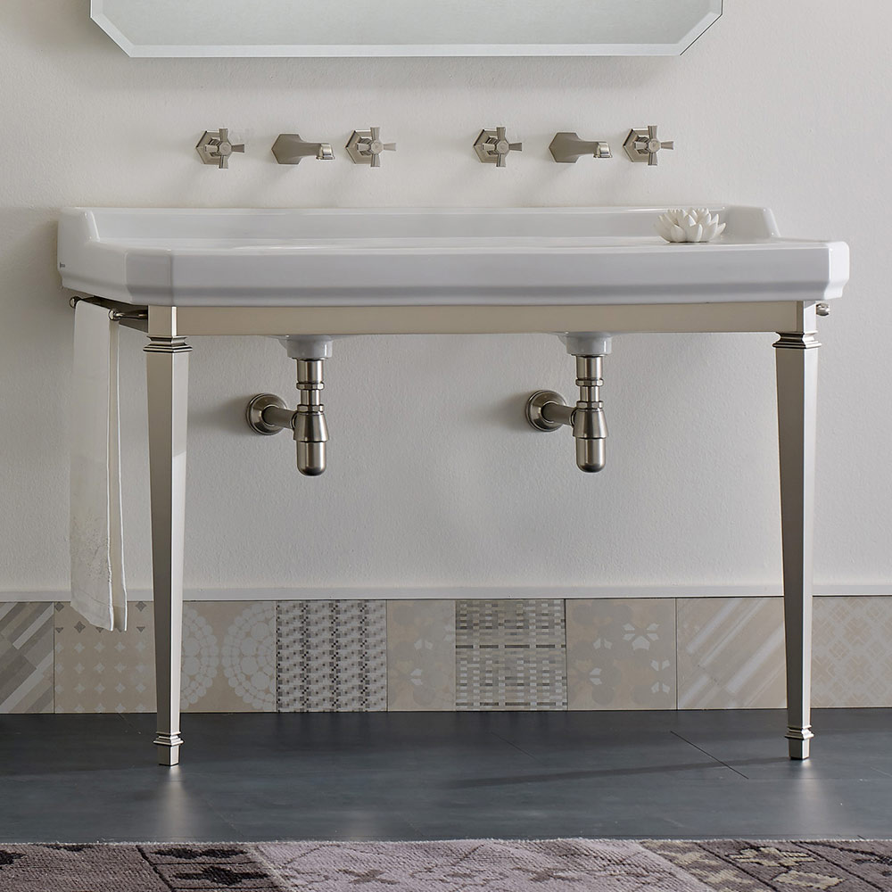 1 sau 3 găuri de robinet pe bazin (specificați numărul de găuri necesare la momentul comenzii), lungime de 1350 mm, susținută de o structură compusă din picioare metalice în finisajul nichel .