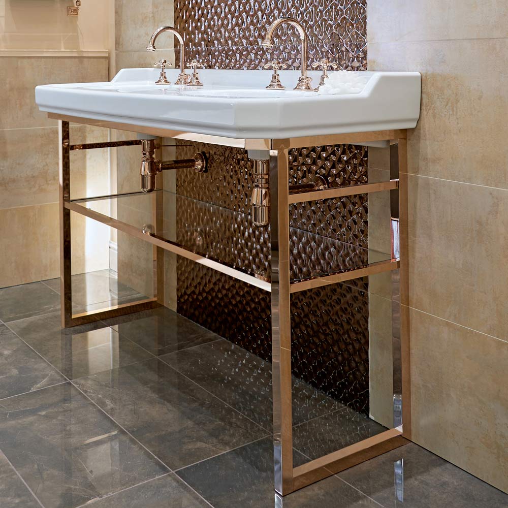 1 sau 3 găuri de robinet pe bazin (specificați numărul necesar de găuri la comandă), lungime de 1350 mm, susținut de o structură compusă din picioare metalice în finisaj auriu roz.