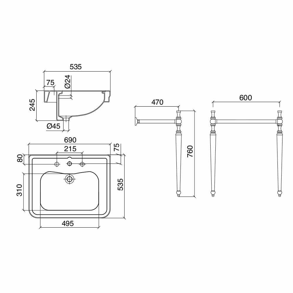 1 sau 3 găuri de robinet (specificați la comandă) și are o lungime de 650 mm. Baza este din metal finisat cu nichel.