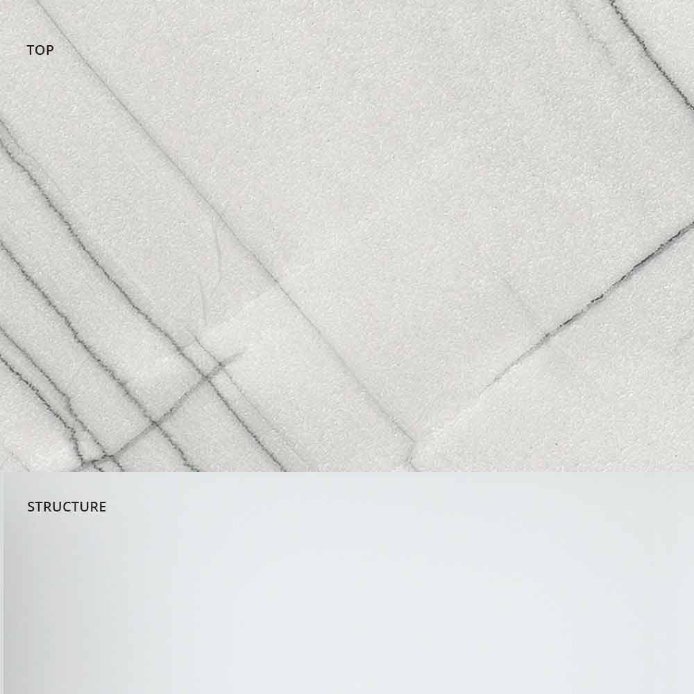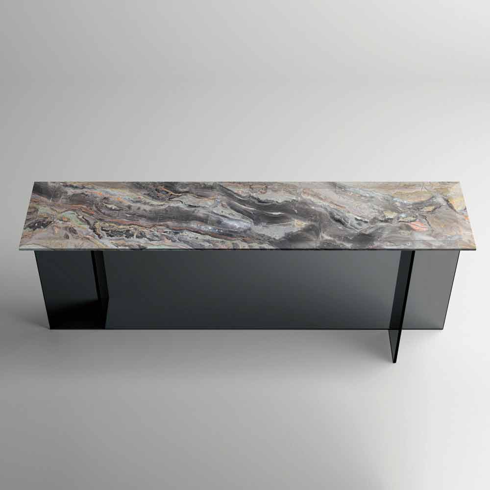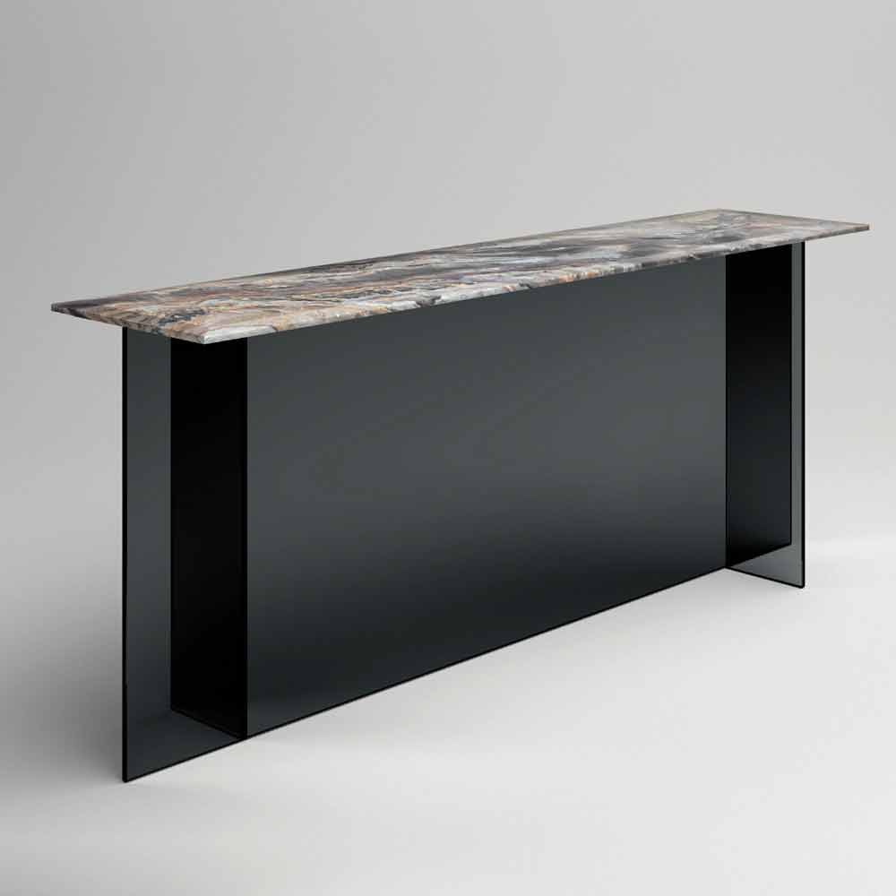 Consolă de design fixă cu blat din marmură teșită și bază din sticlă Made in Italy.