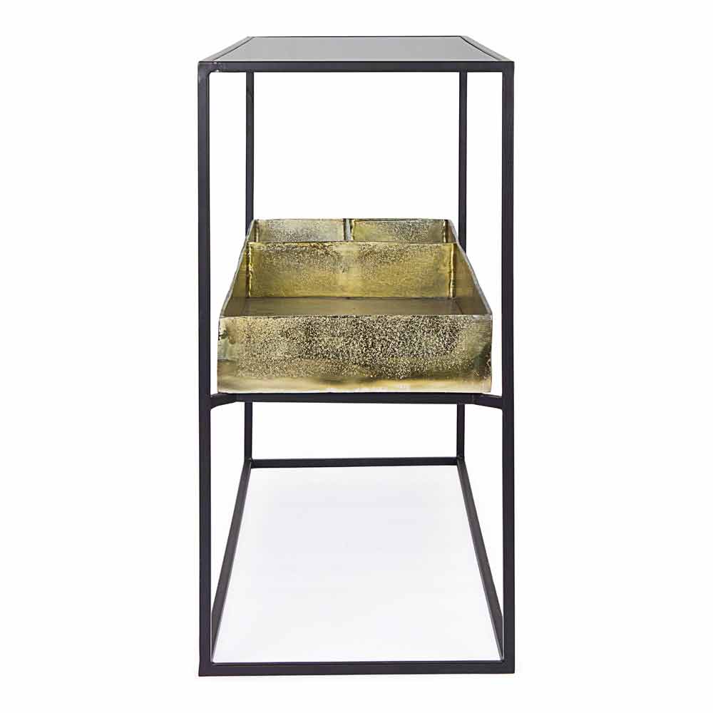 Raftul de jos, cu un recipient din aluminiu , cu un finisaj placat cu alamă și antichizat, completează stilul minimal și geometric al complementului, conferindu - i eleganta si modernitate, pentru spațiile dvs. de lux.