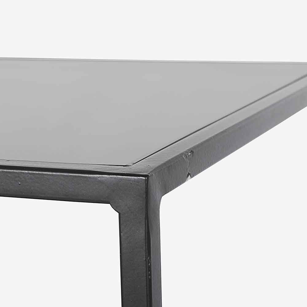 Această consolă de design este realizată cu o structură din oțel acoperită cu pulbere epoxidică și cu un top din sticlă .
