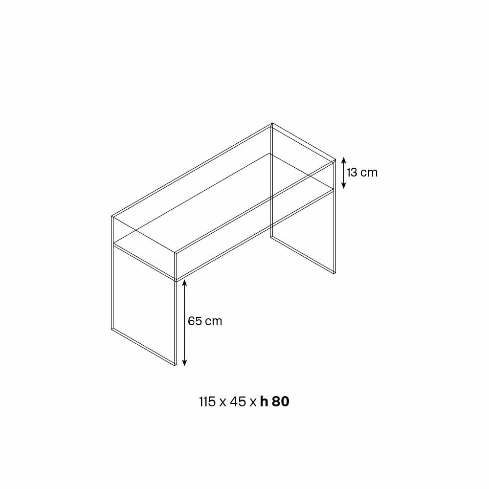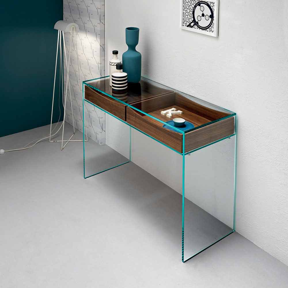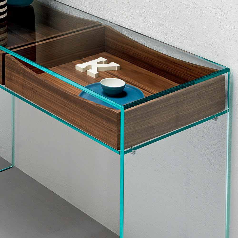 Consola este o piesă de mobilier care poate fi utilizată transversal în diverse contexte și are o structură de punte simplă și liniară din sticlă extra-clară cu două sertare subiacente din nuc canaletto.