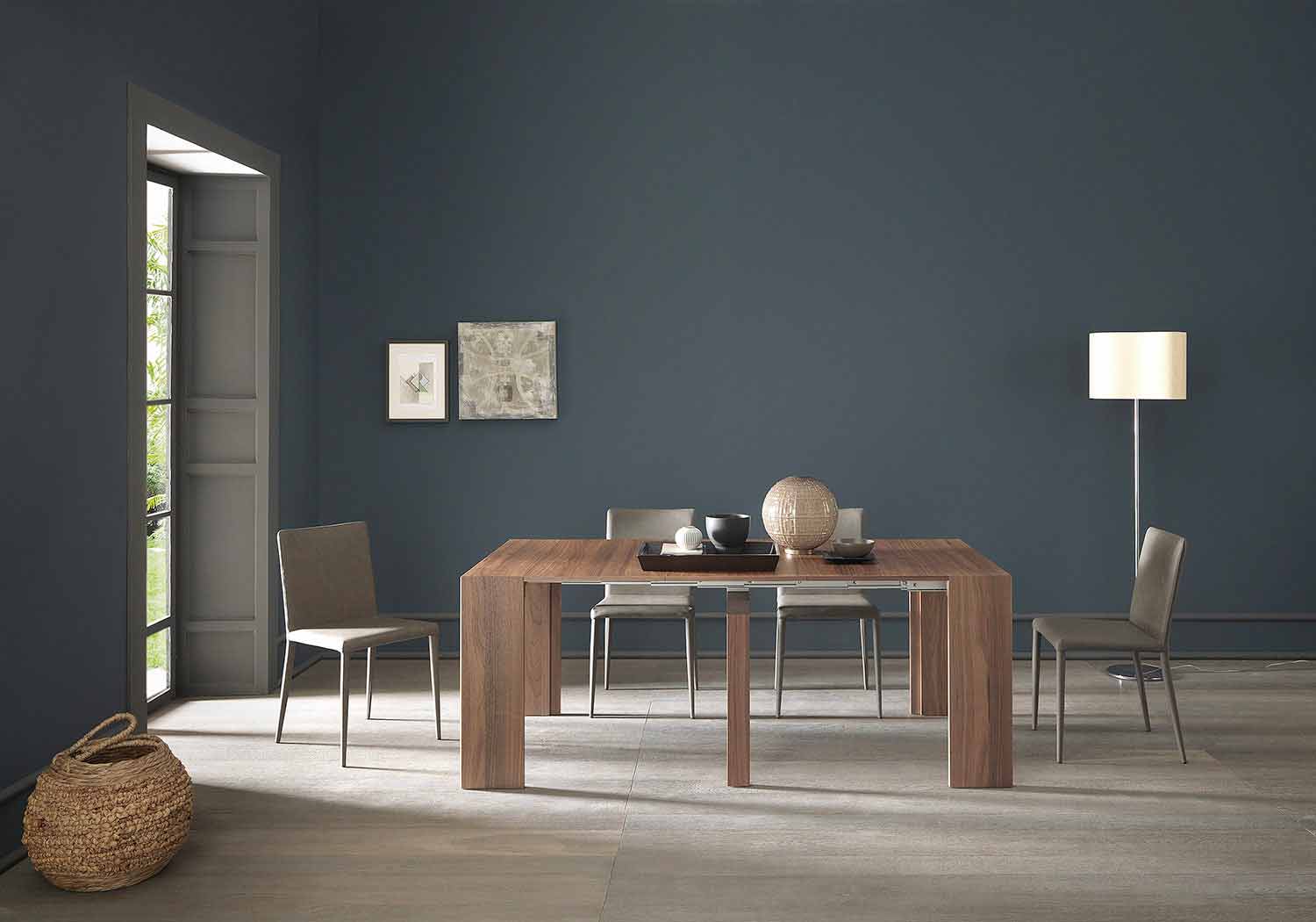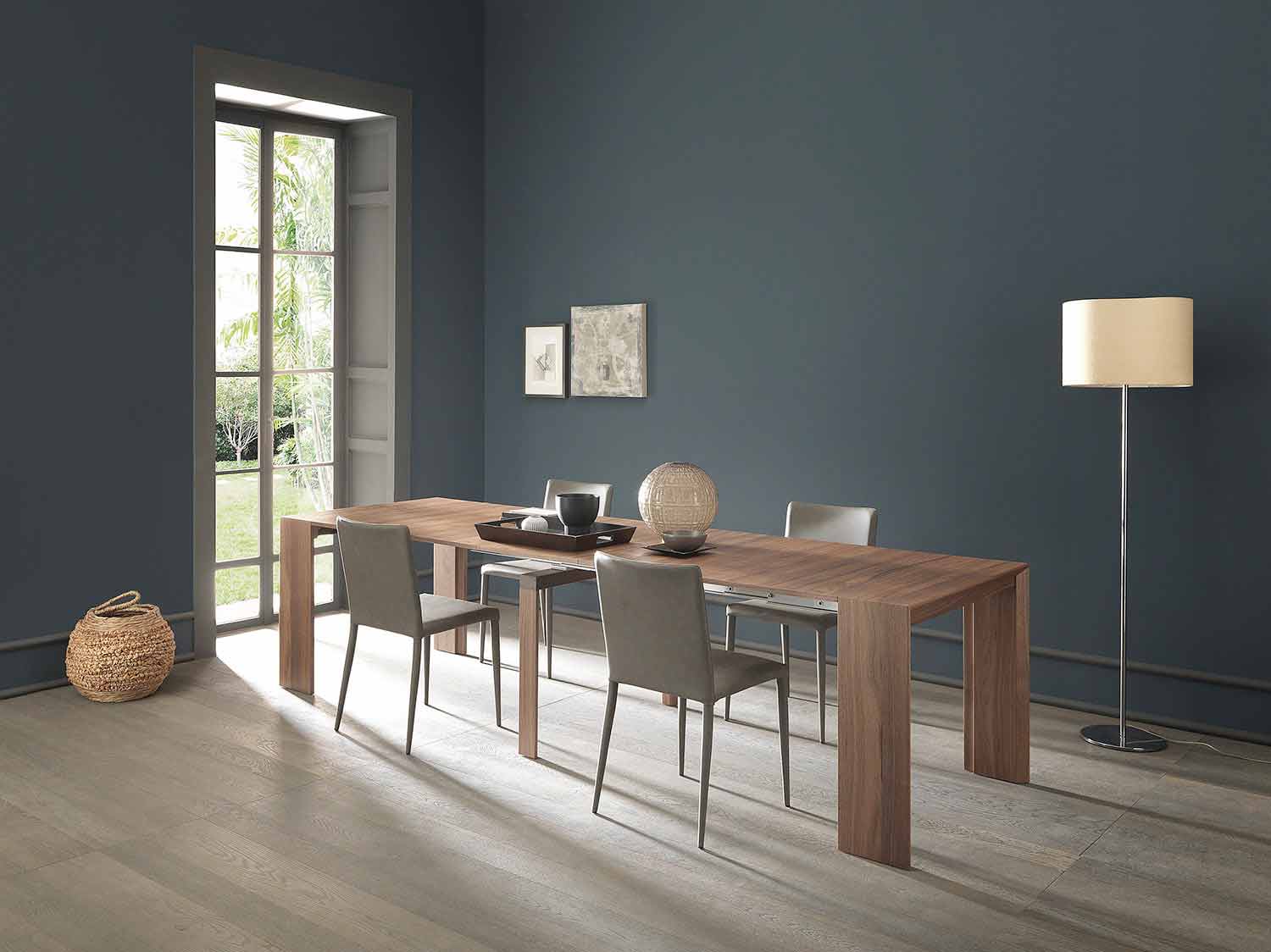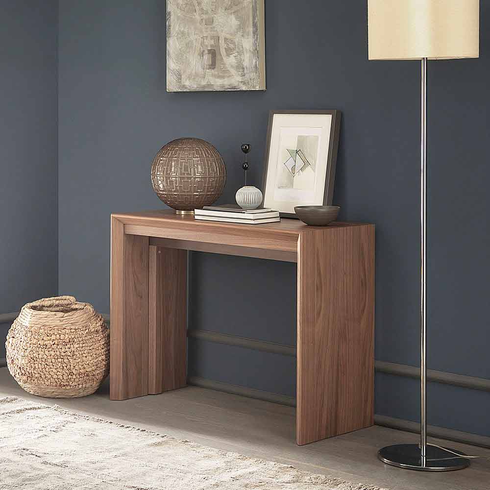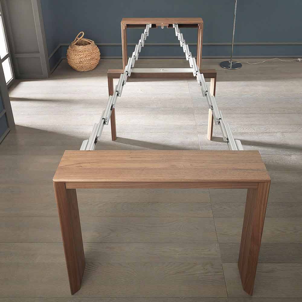 Consolă transformabilă într-o masă din lemn furniruit, cu picioare pivotante centrale Made in Italy.