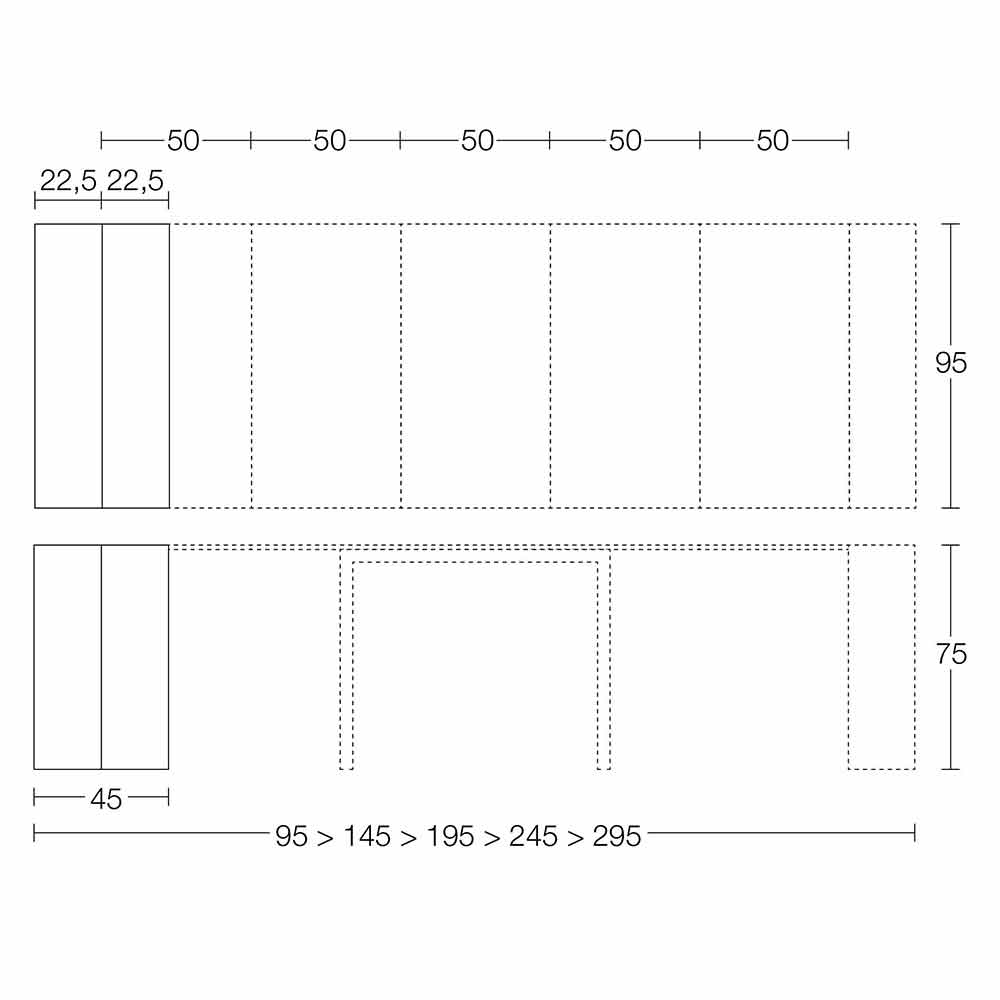 - Consola: L 95 x D 45 x H 75 cm; Masa: L 95/145/195/245/295 x D 95 x H 75 cm