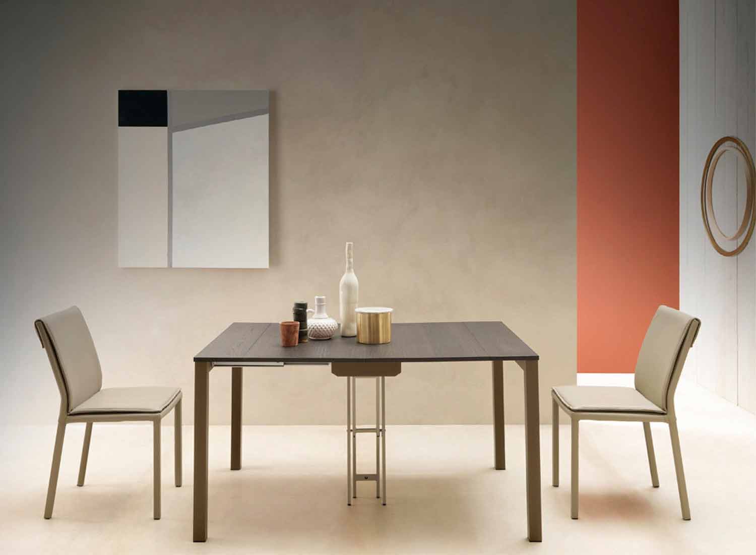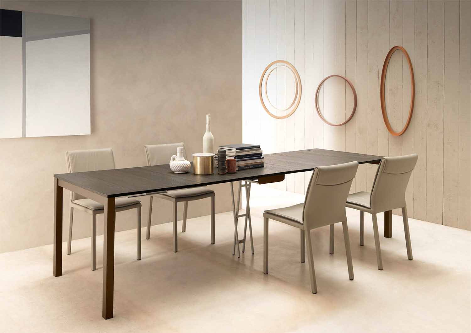 disponibil cu maxim 3 sau 5 prelungiri cu același finisaj ca și blatul de 50 cm fiecare, pentru a găzdui până la 12 invitați, cu picioare de sprijin centrale.