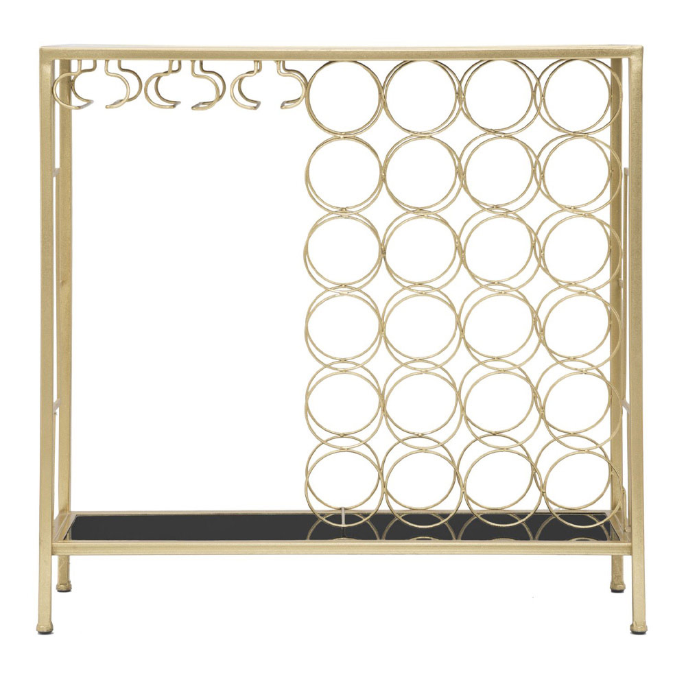Consolă modernă din fier aurit și sticlă neagră dotată cu compartimente pentru sticle.