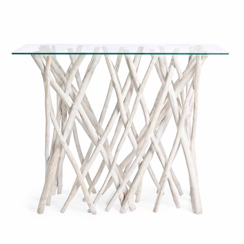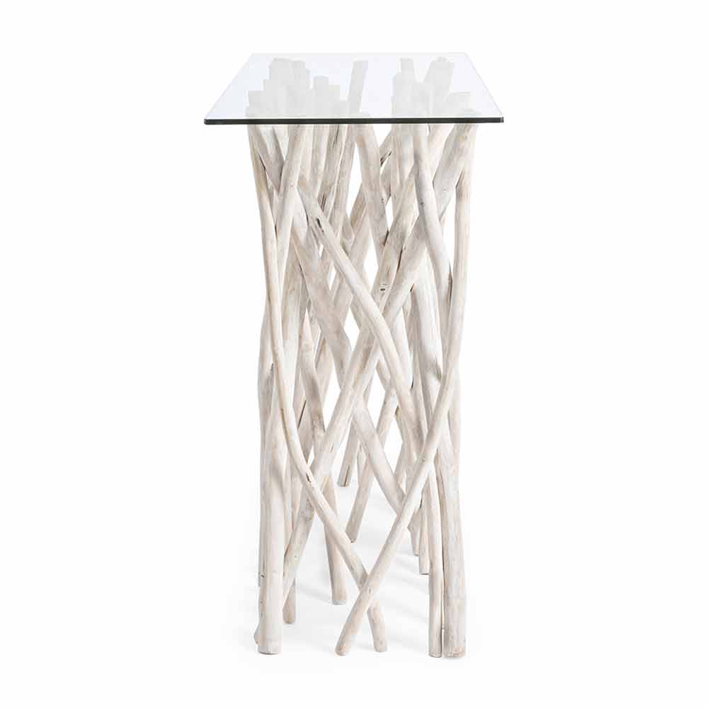 Această consolă de design este realizată cu un blat din sticlă netemperată de 8 mm grosime, susținut de o bază de ramuri din lemn de tec alb cu un finisaj natural.