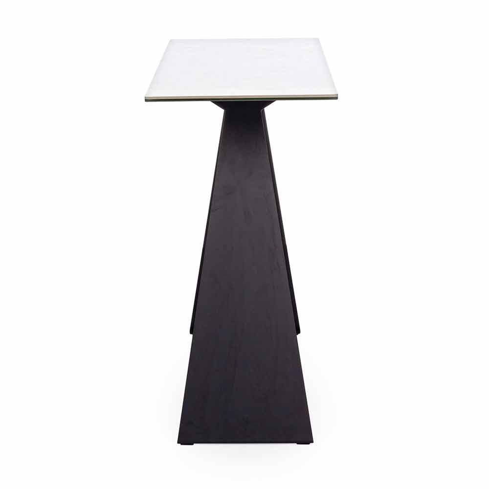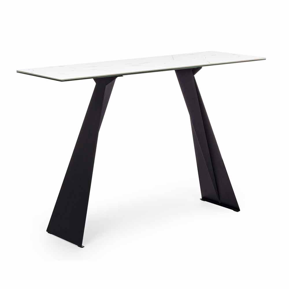Această consolă de design are picioare din oțel acoperite cu pulbere epoxidică și un blat ceramic de 5 mm grosime susținut de un strat de sticlă securizată de 6 mm grosime.