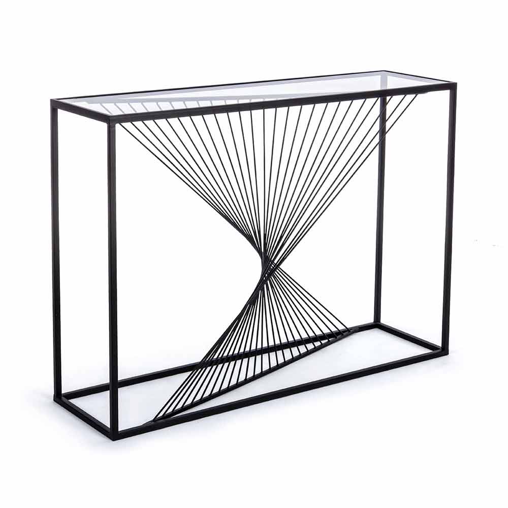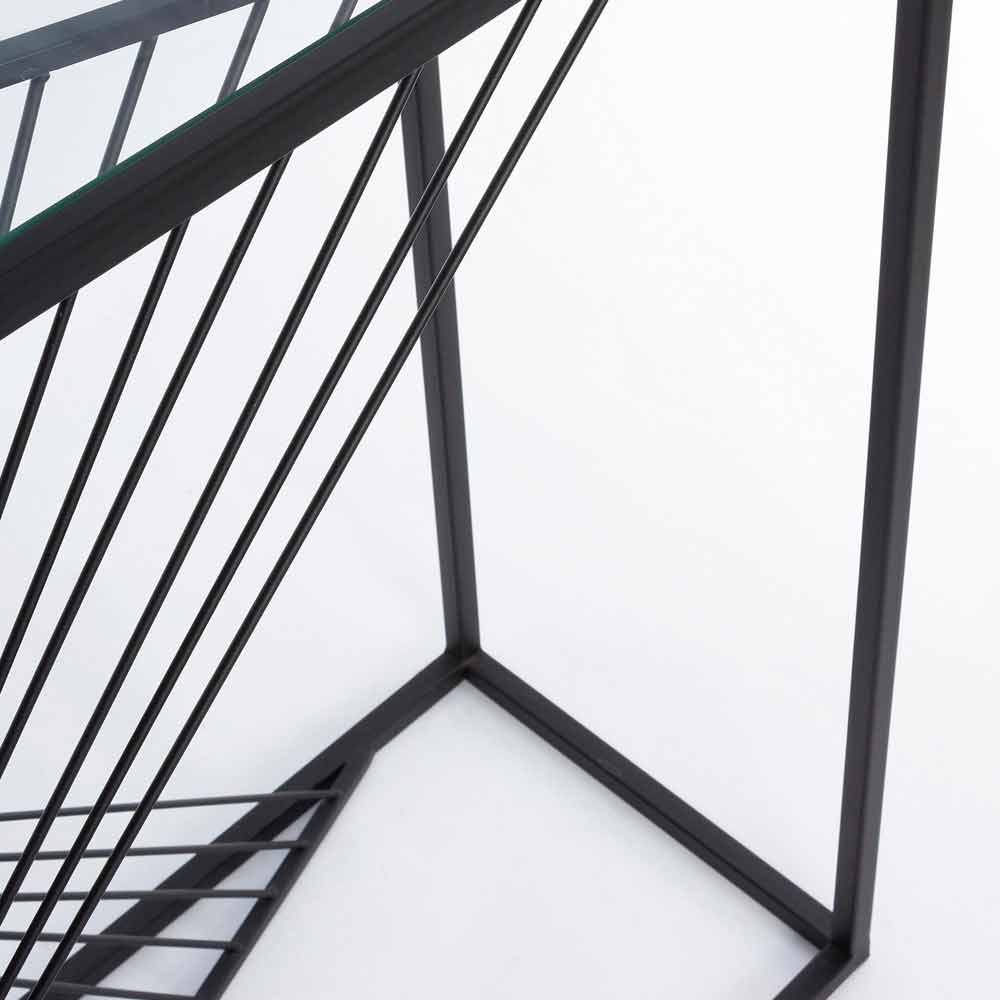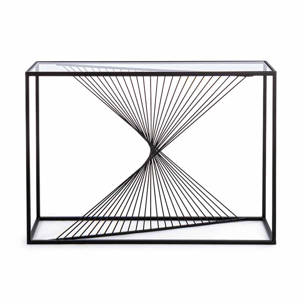 Această consolă de design are o structură dreptunghiulară minimă din oțel acoperit cu pulbere epoxidică și un blat de sticlă călită .
