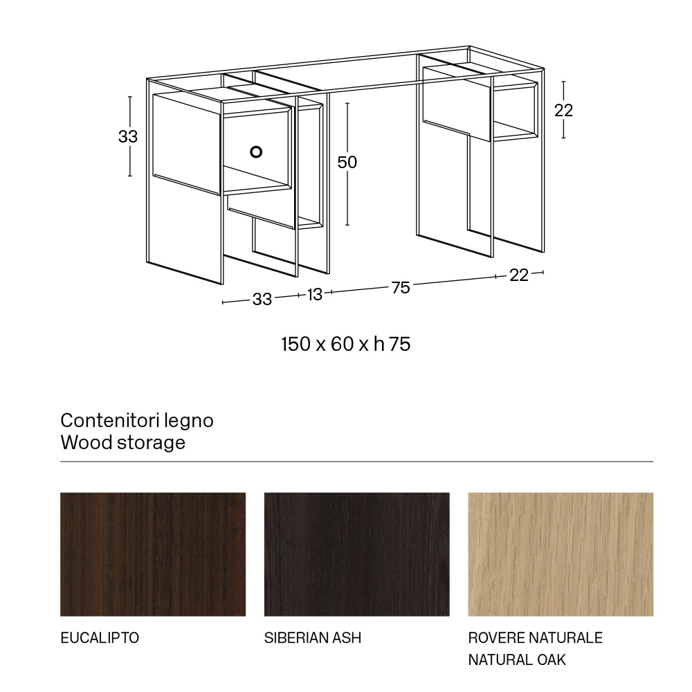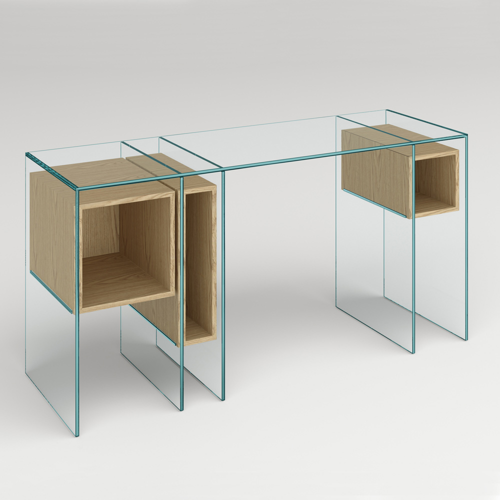 mare versatilitate de utilizare în diferitele încăperi ale casei, deoarece a luat naștere ca birou, dar își găsește locul și la intrare ca o consolă practică sau în interiorul zonei de dormit ca o masă de toaletă. Finisajele minunate ale lemnului propuse creează o armonie perfectă cu sticla oferind astfel soluții de amenajare exclusive și de clasă, ideale pentru satisfacerea oricărei nevoi stilistice și pentru mobilarea oricărui spațiu casnic cu personalitate cu o